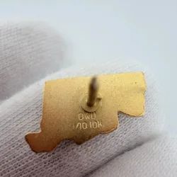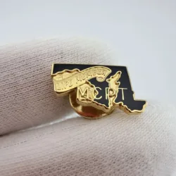 This pin is shaped like the state of Maryland with “MCPT” along the bottom. At the top left, a banner reads “LIFE MEMBER.” The piece is marked 1/10 10K gold filled.