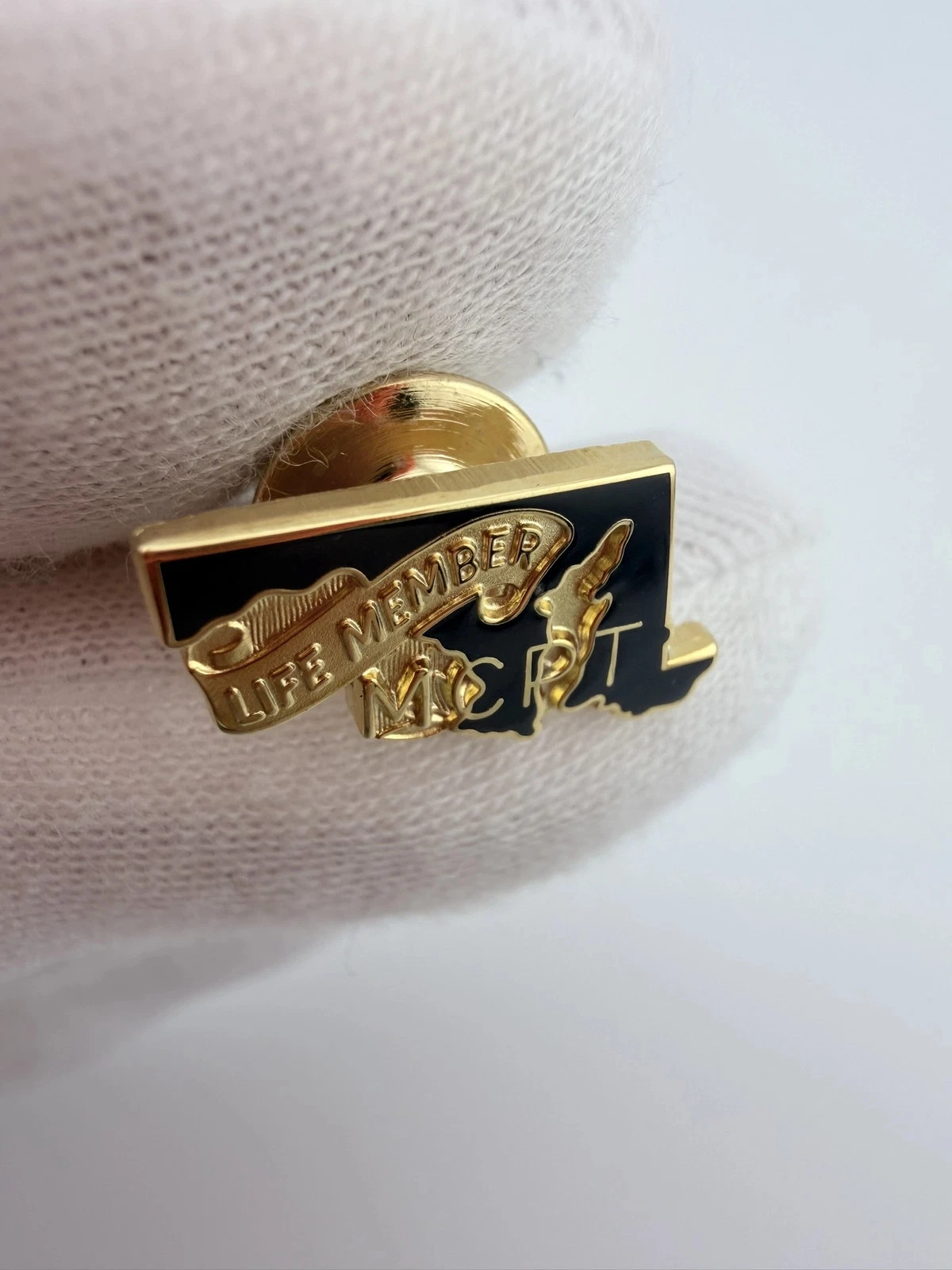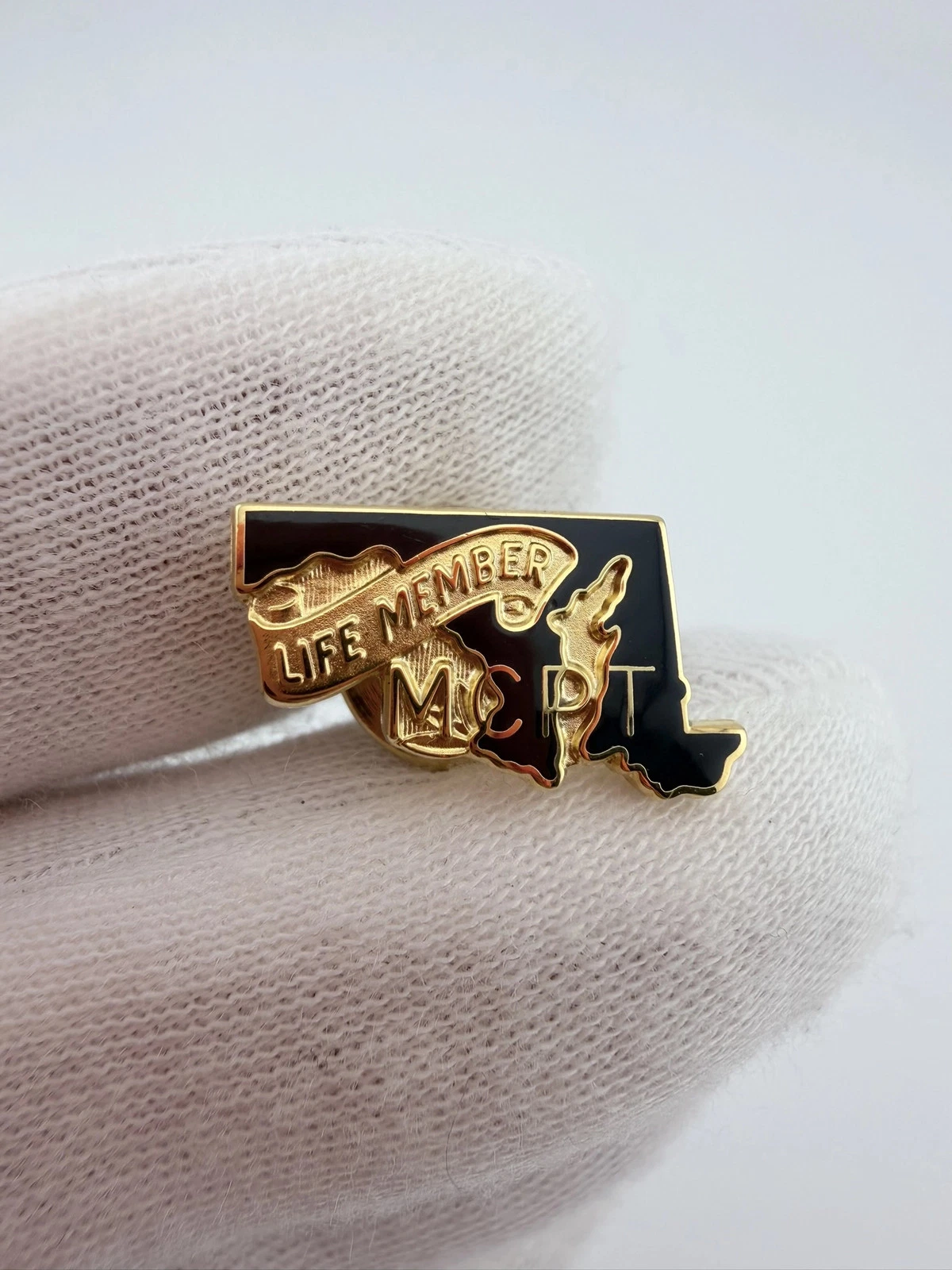 This pin is shaped like the state of Maryland with “MCPT” along the bottom. At the top left, a banner reads “LIFE MEMBER.” The piece is marked 1/10 10K gold filled.