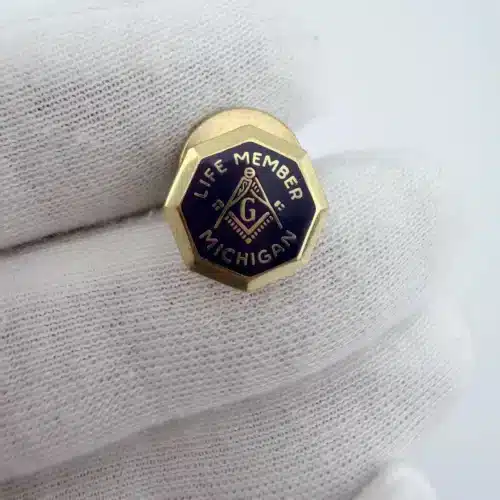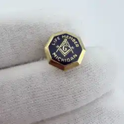 This Masonic Michigan Life Member Pin features a striking dark purple enamel background, accentuated by the classic Masonic compass logo at its center. The pin prominently displays ‘Life Member’ at the top and ‘Michigan’ at the bottom, crafted by Terryberry and finished in 24K gold plating.