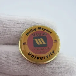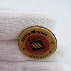 This pin is circular with text around the outer edge reading “Heilig-Meyers University.” At the center is the Maytag wavy “M” logo.