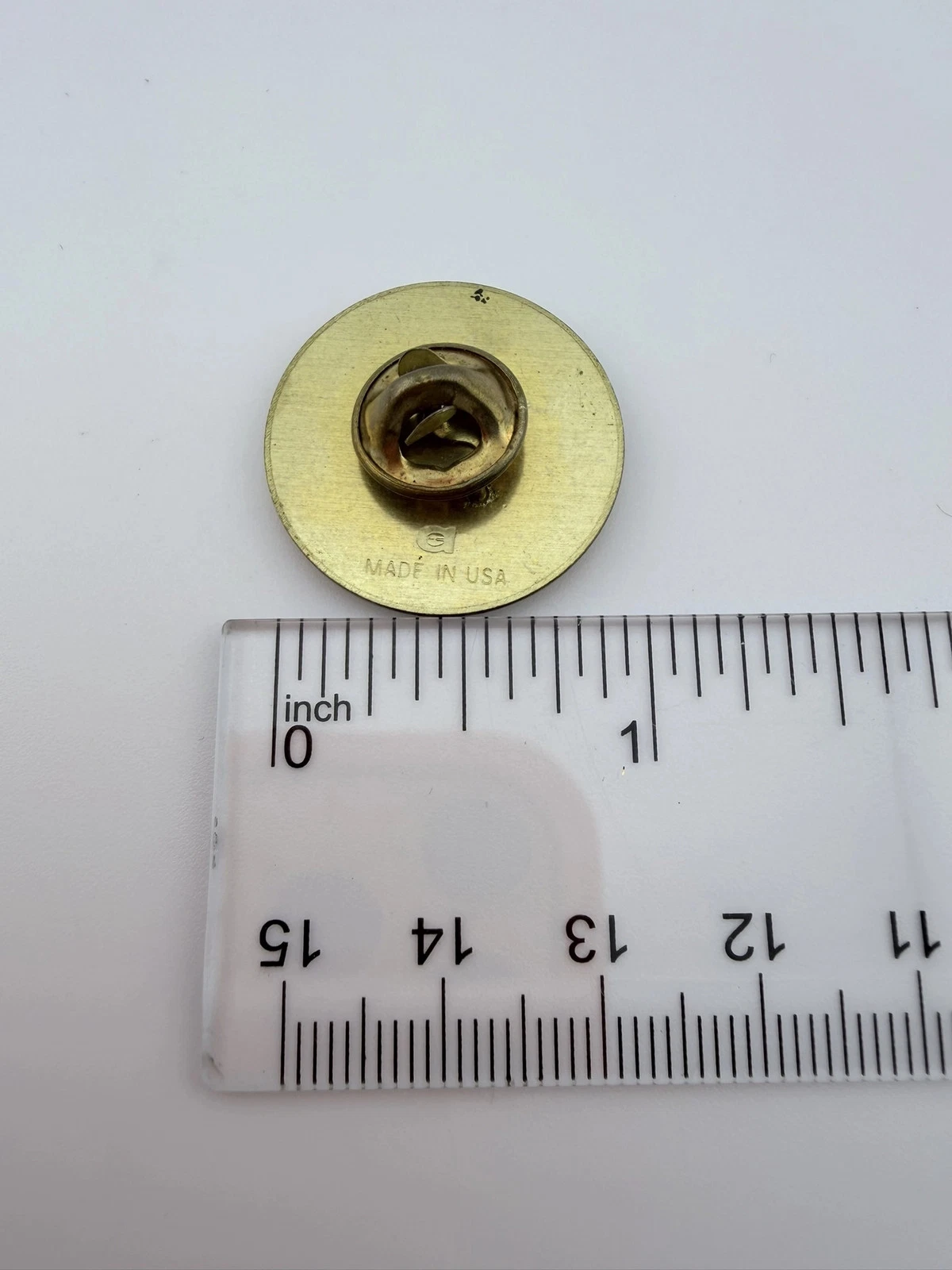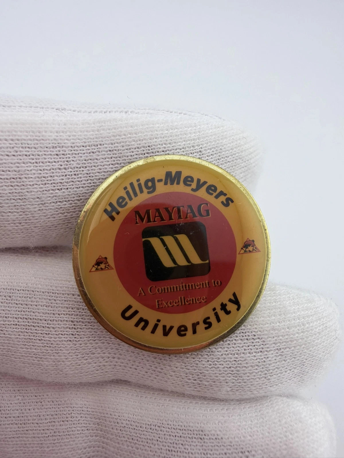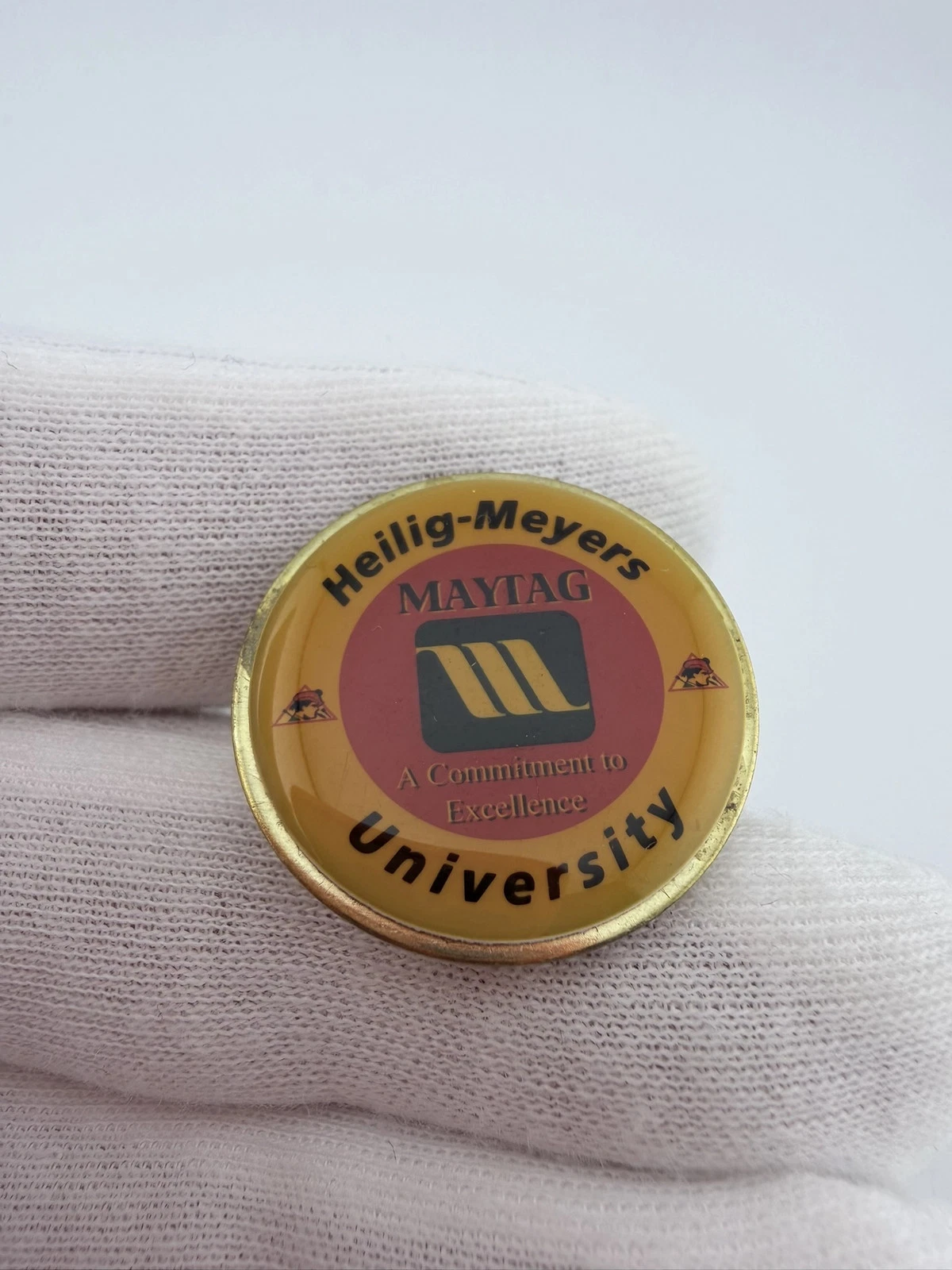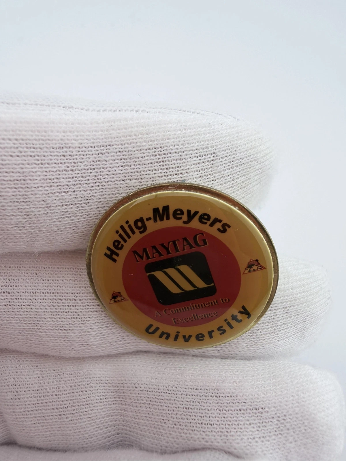 This pin is circular with text around the outer edge reading “Heilig-Meyers University.” At the center is the Maytag wavy “M” logo.