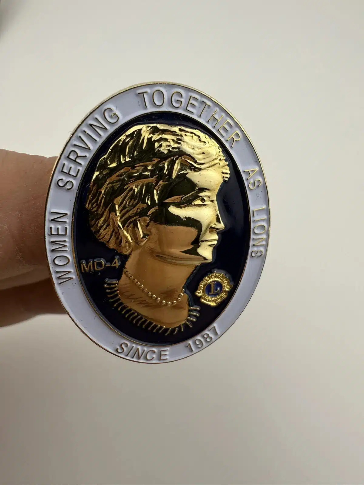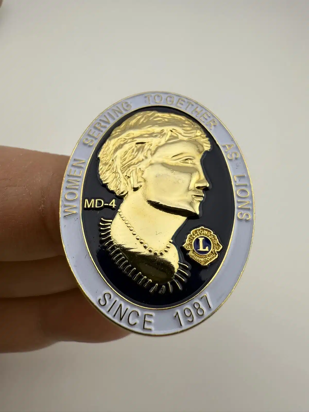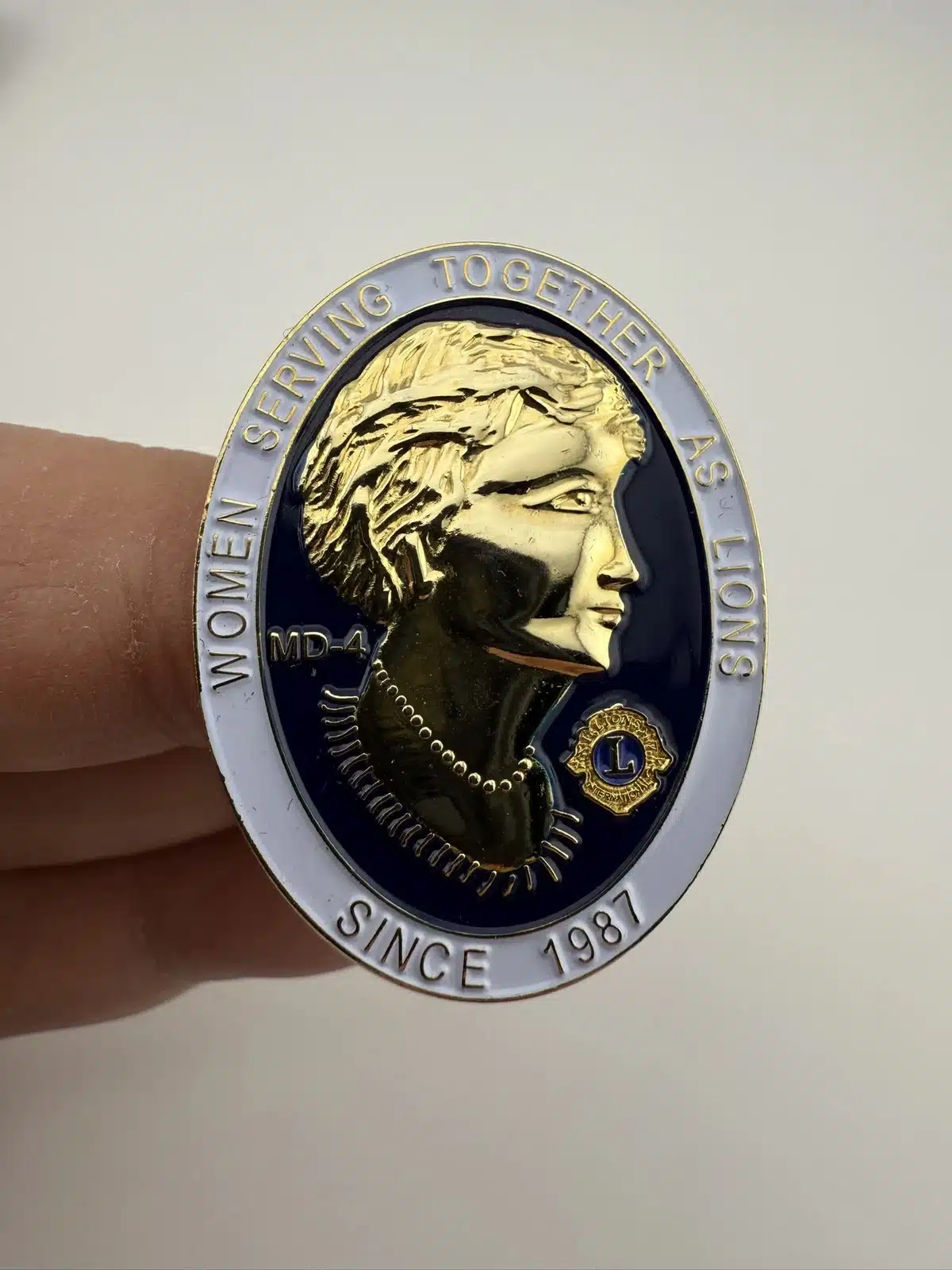 This Lions Club pin is from Multiple District #4 in California. It features a woman in gold tone surrounded by the text Women Serving Together As Lions since 1987 around the outside. Very nice looking for sure.