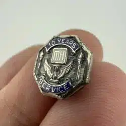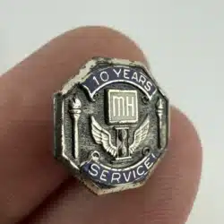 Unique 10 year employee service pin from Minneapolis Honeywell Regulator Company (MH). This pin is made of sterling silver and features the letters MH, a winged hourglass below, and a flame on each side.