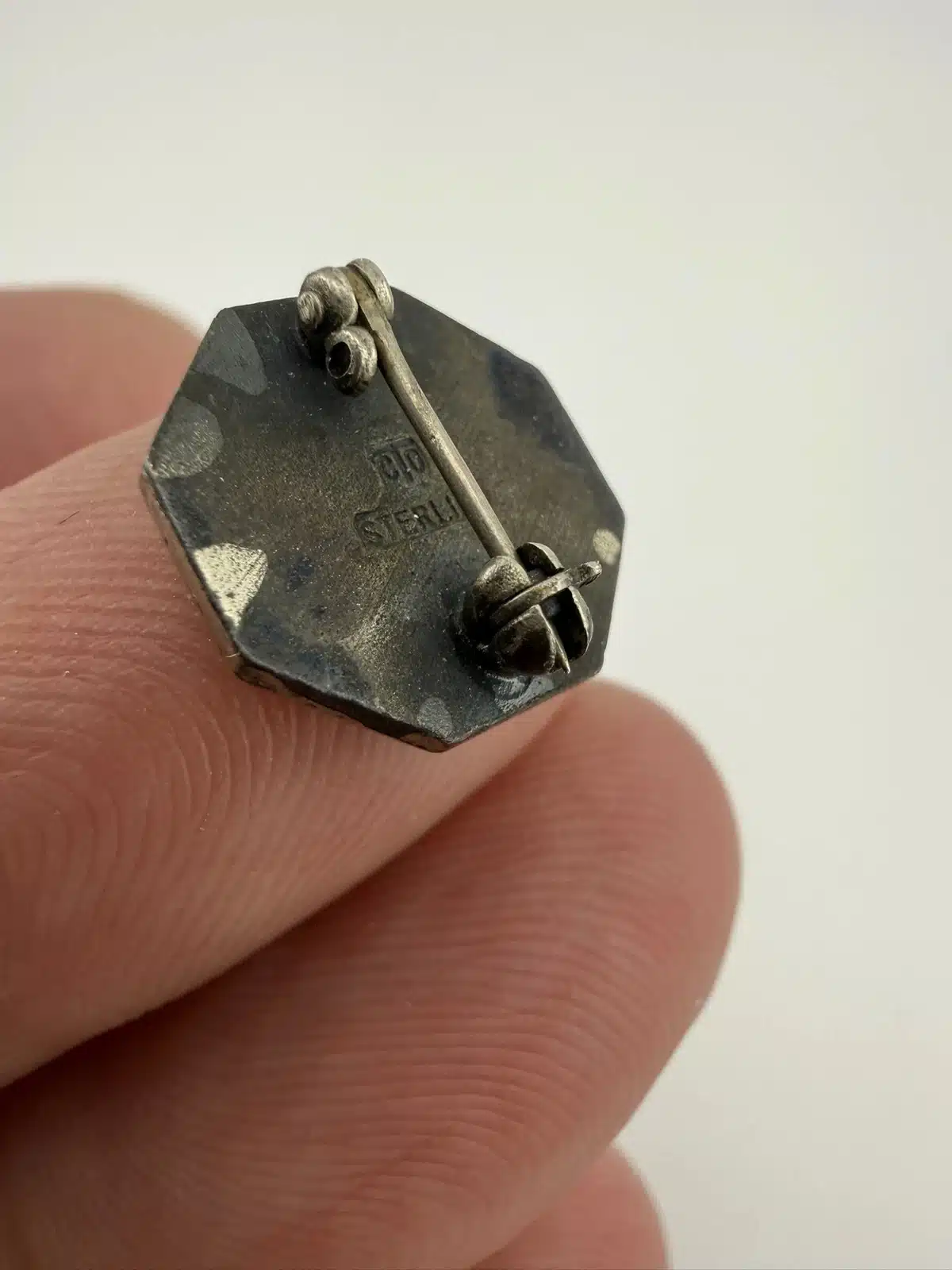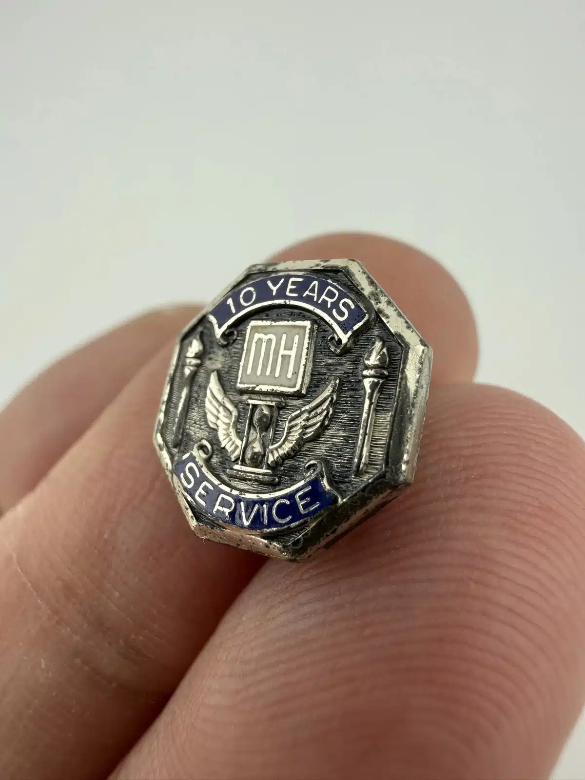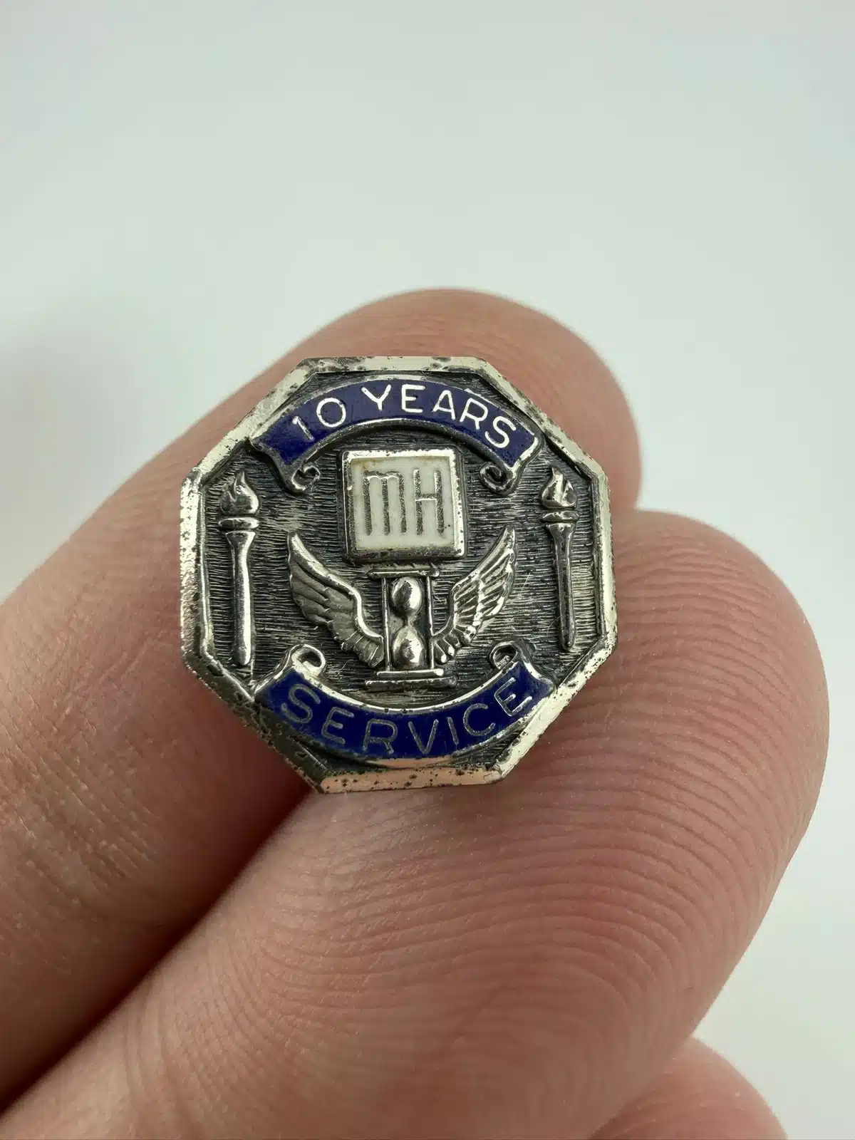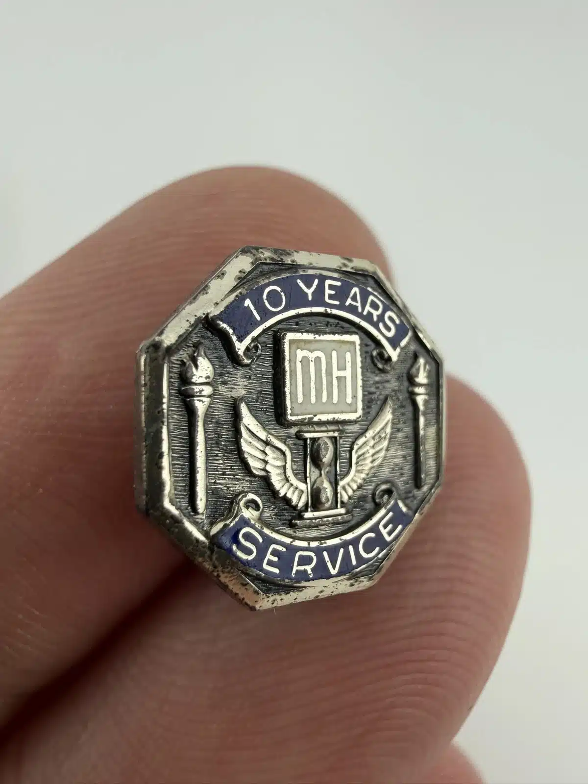 Unique 10 year employee service pin from Minneapolis Honeywell Regulator Company (MH). This pin is made of sterling silver and features the letters MH, a winged hourglass below, and a flame on each side.