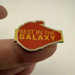 This pin features a striking red silhouette of the Millennium Falcon, a legendary starship from the Star Wars franchise, known for its speed and iconic design. Above the silhouette, the text ‘Best In The Galaxy’ is prominently displayed, celebrating the ship’s status within the beloved sci-fi universe.