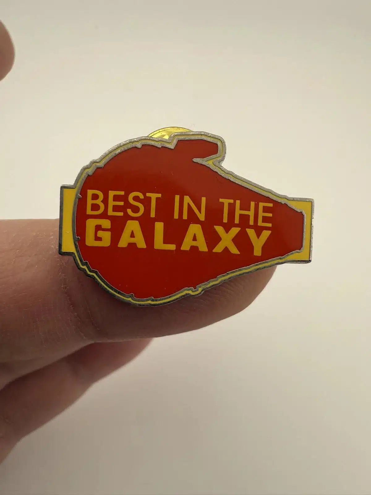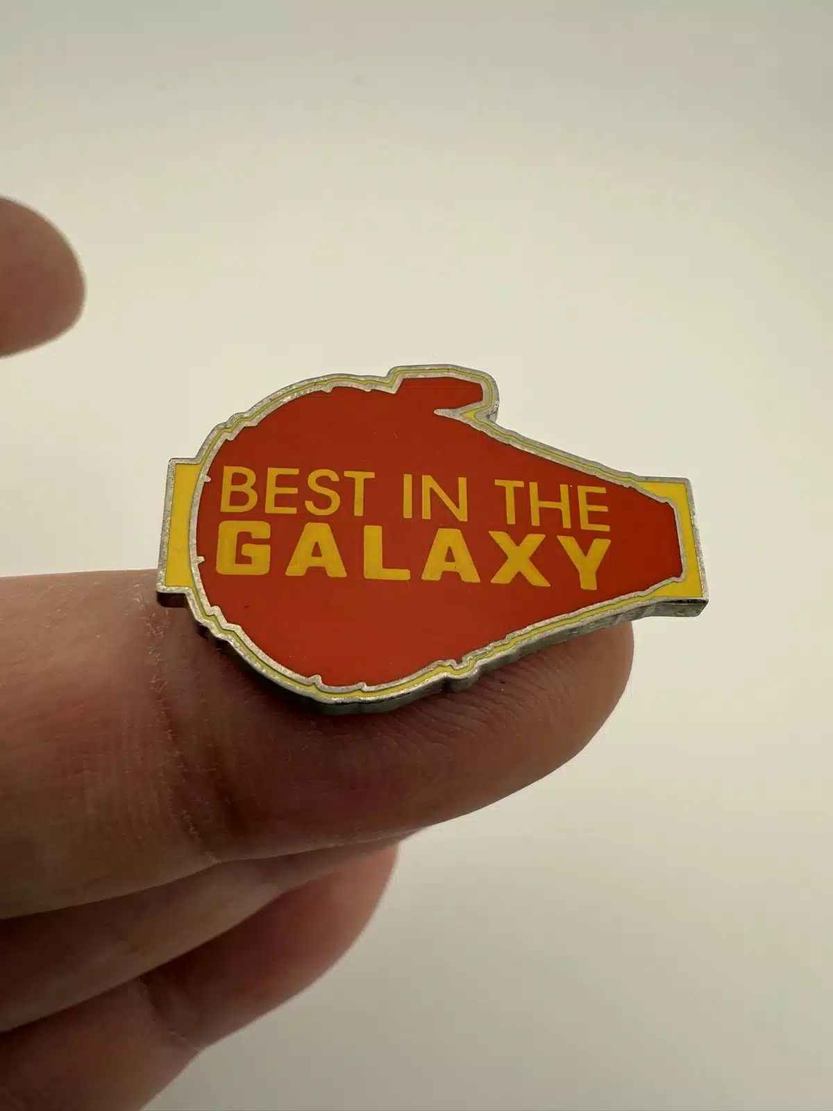 This pin features a striking red silhouette of the Millennium Falcon, a legendary starship from the Star Wars franchise, known for its speed and iconic design. Above the silhouette, the text ‘Best In The Galaxy’ is prominently displayed, celebrating the ship’s status within the beloved sci-fi universe.