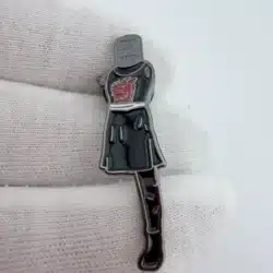 This lapel pin features the iconic Black Knight from Monty Python and the Holy Grail, depicted standing on one leg with his limbs removed, capturing the character’s humorous resilience. Produced by the Philosophers Guild, the design pays homage to the classic 1975 film and its enduring legacy in comedy.
