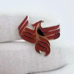 This striking pin features a mythological phoenix bird, depicted in vibrant red and silver tones, symbolizing rebirth and immortality. The intricate design captures the essence of this legendary creature, known for rising from its own ashes in various mythologies.