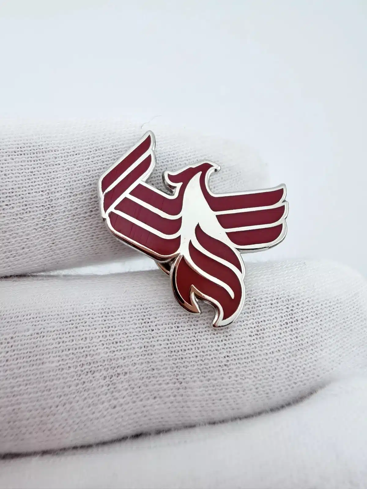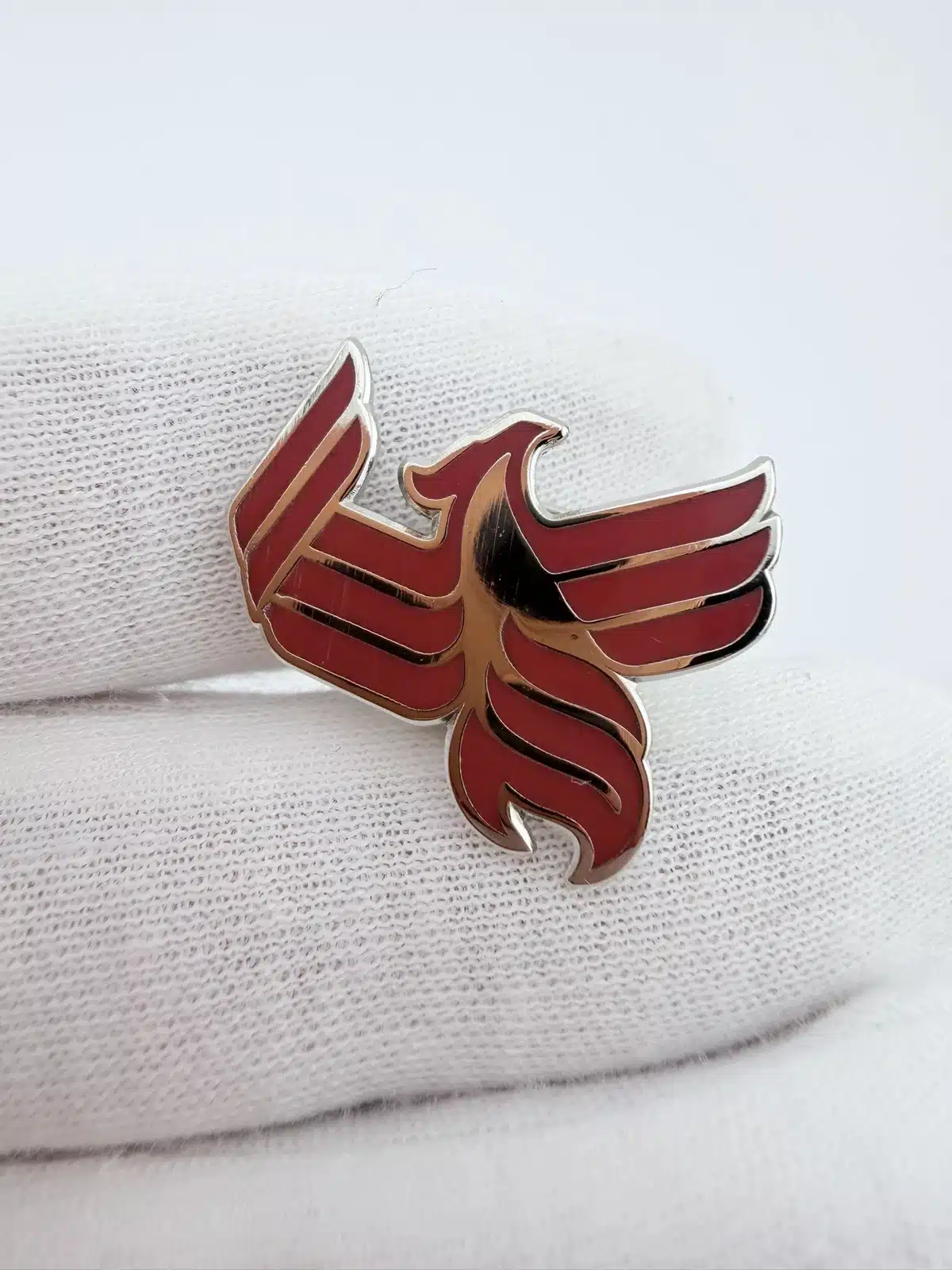 This striking pin features a mythological phoenix bird, depicted in vibrant red and silver tones, symbolizing rebirth and immortality. The intricate design captures the essence of this legendary creature, known for rising from its own ashes in various mythologies.