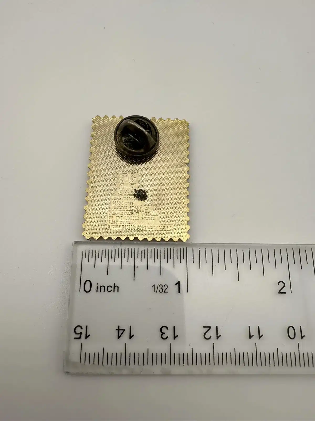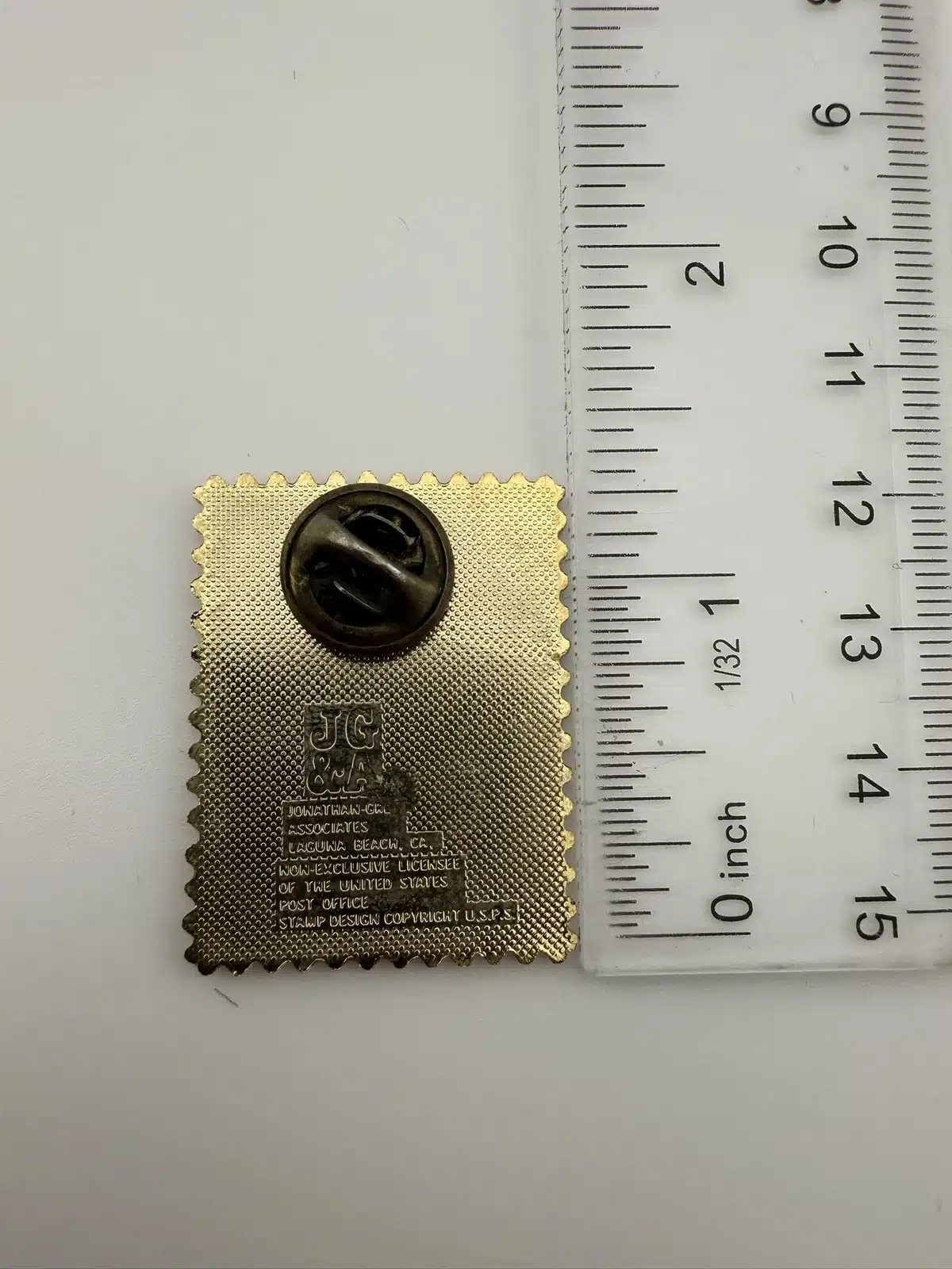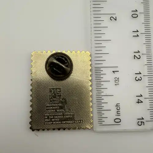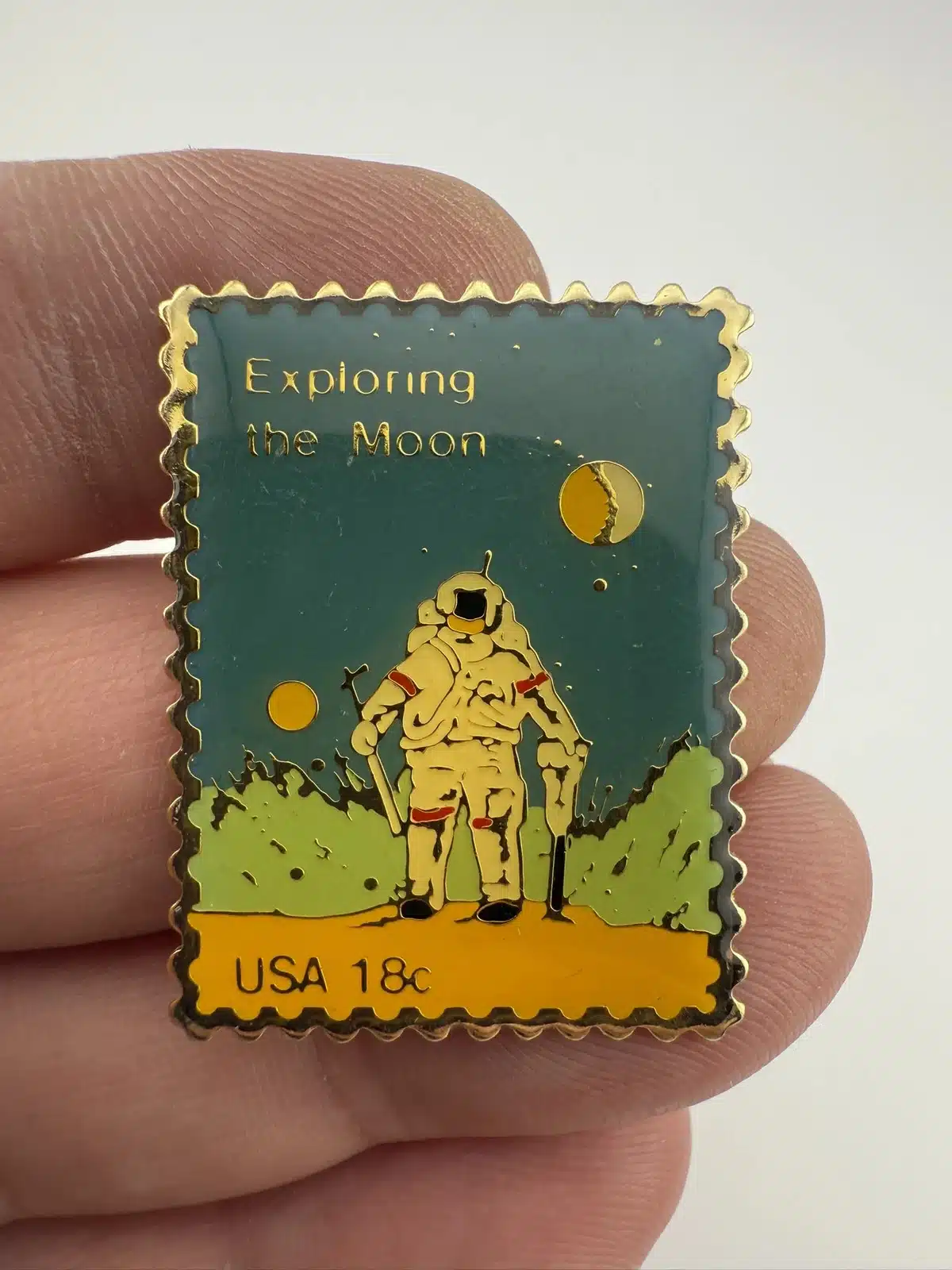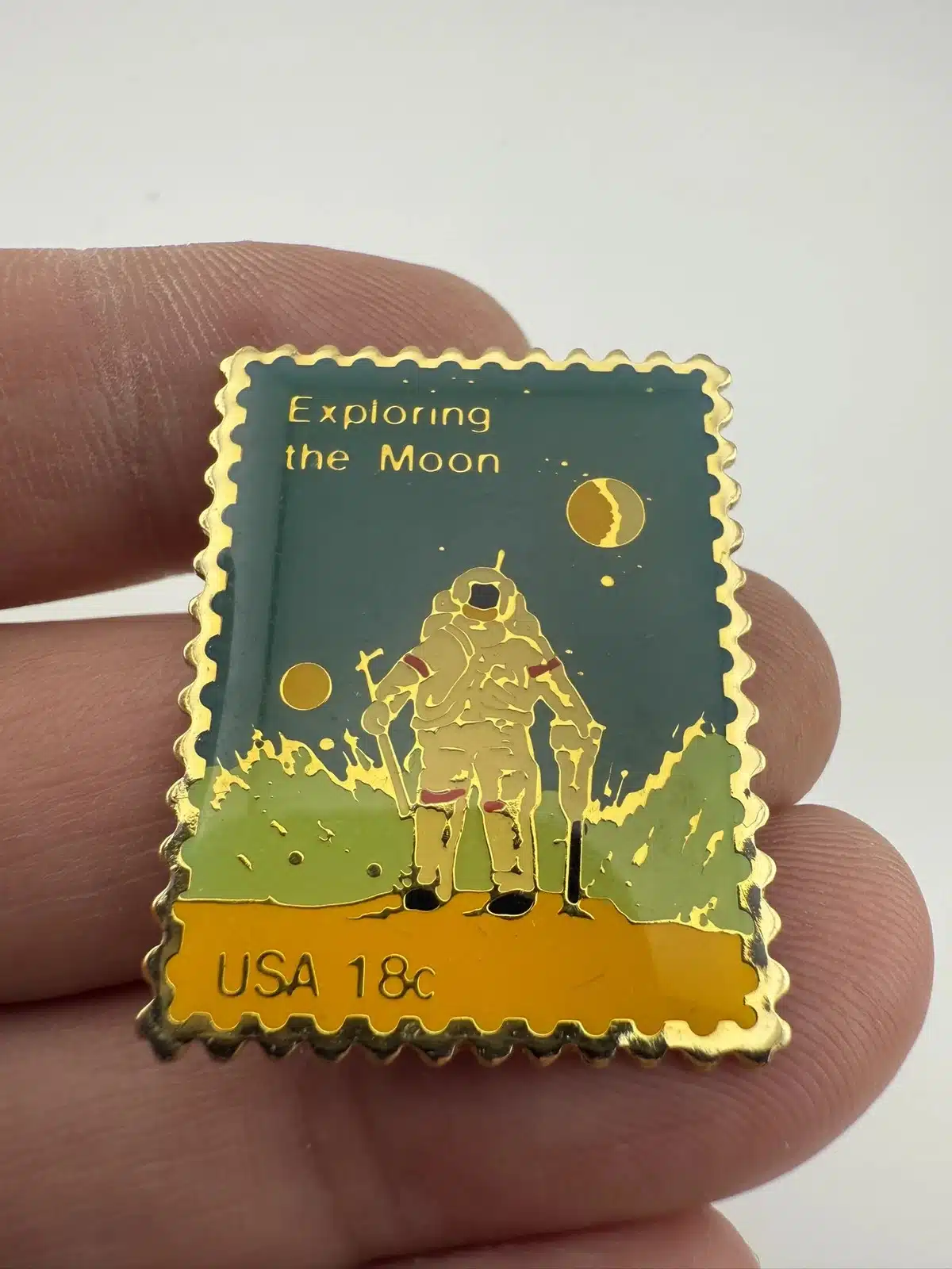 This pin features a detailed depiction of a NASA astronaut exploring the lunar surface, inspired by the iconic 18-cent USPS stamp commemorating the Apollo moon missions.