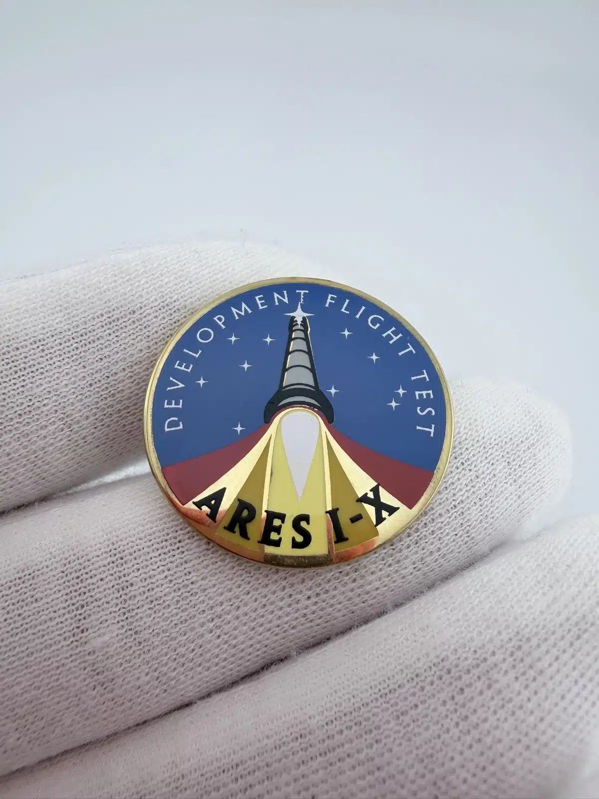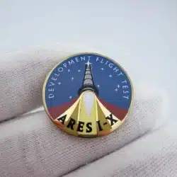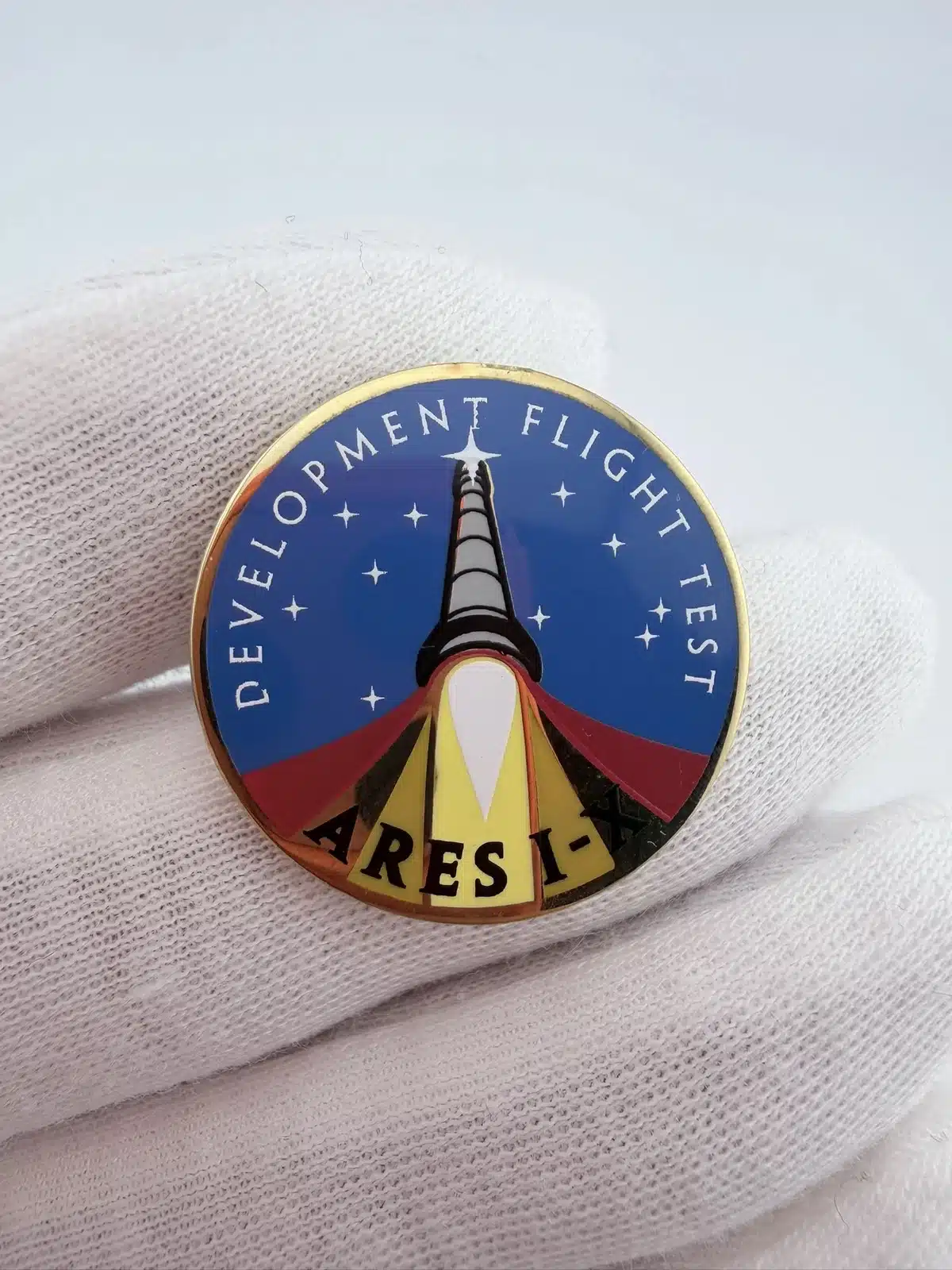 This pin commemorates the ARES I-X, NASA’s first test flight of the Ares I rocket, which took place in 2009 as part of the Constellation program. The design features the rocket’s silhouette shooting into space, symbolizing a significant step in the agency’s exploration goals.