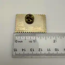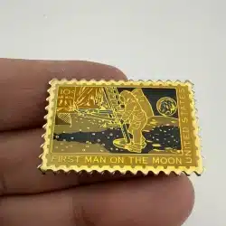 This pin features a detailed representation of the iconic 10-cent USPS airmail stamp commemorating the historic Apollo 11 moon landing, showcasing an image of astronaut Neil Armstrong. The design captures the essence of this monumental event in 1969, celebrating humanity’s first steps on the lunar surface.