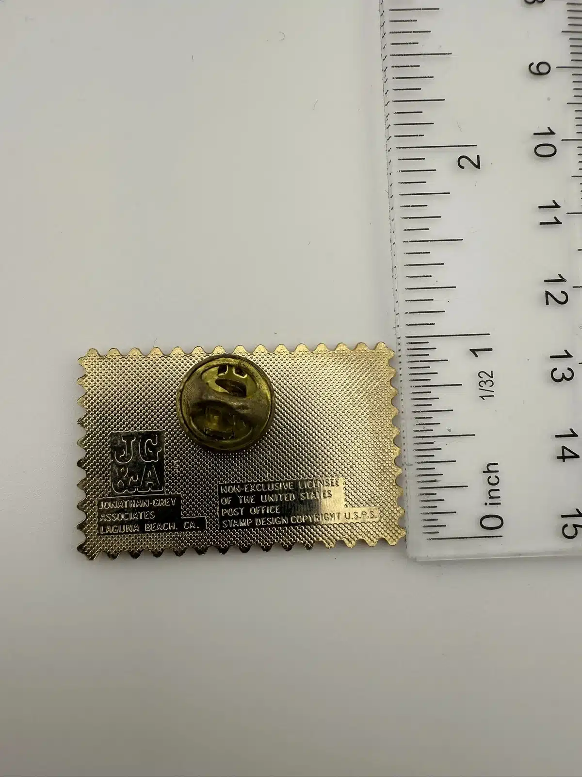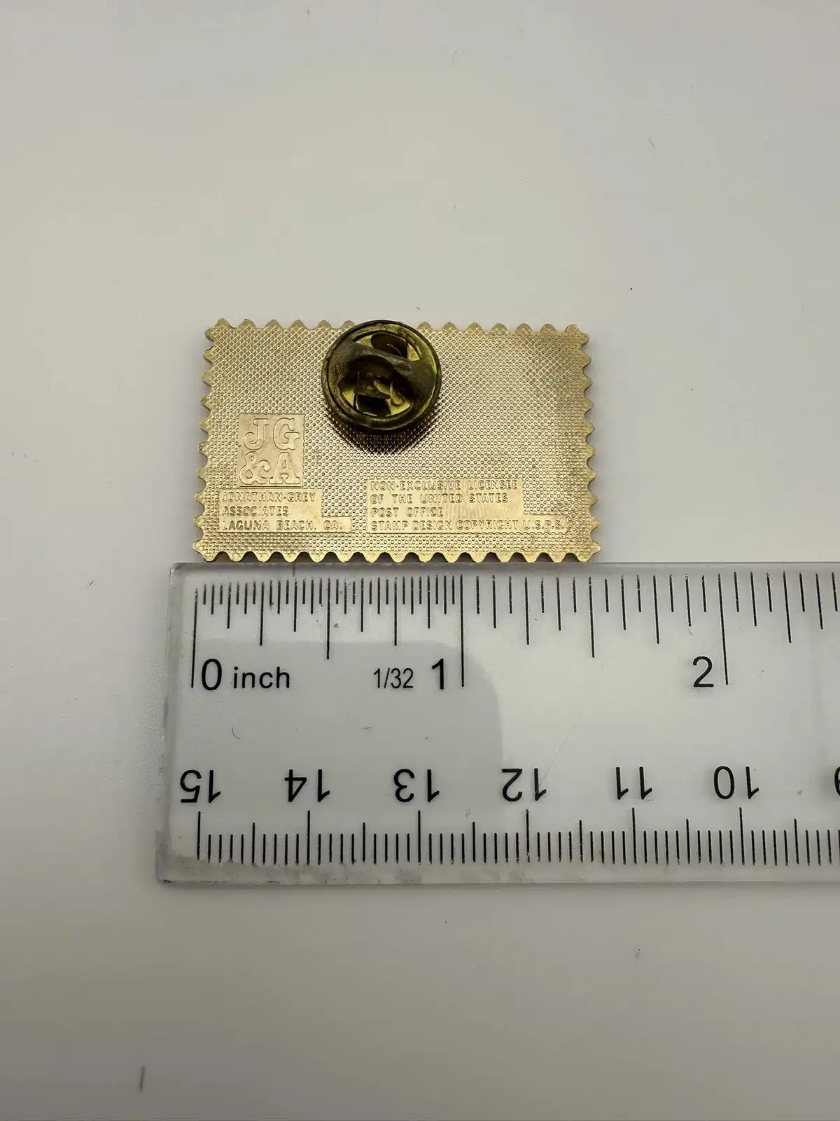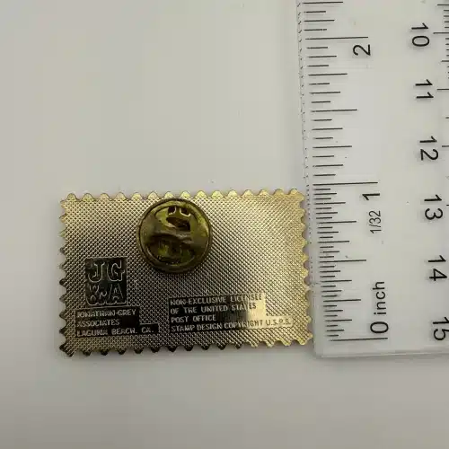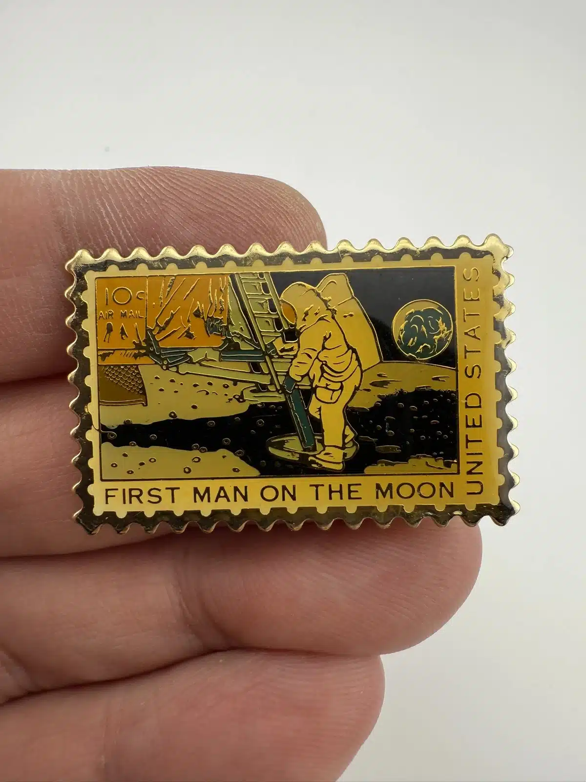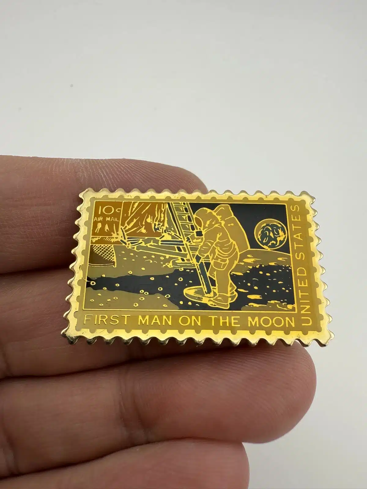 This pin features a detailed representation of the iconic 10-cent USPS airmail stamp commemorating the historic Apollo 11 moon landing, showcasing an image of astronaut Neil Armstrong. The design captures the essence of this monumental event in 1969, celebrating humanity’s first steps on the lunar surface.