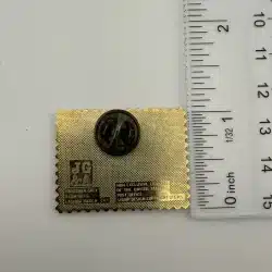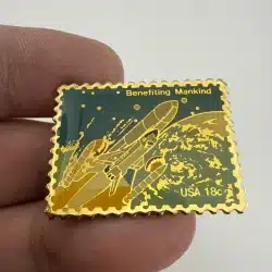 This pin features a detailed depiction of the NASA Space Shuttle in the process of dropping its solid rocket boosters, capturing a pivotal moment in space exploration history. The design is inspired by the 18-cent USPS stamp titled ‘Benefitting Mankind,’ which celebrates the advancements made through NASA’s missions.