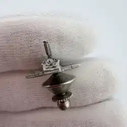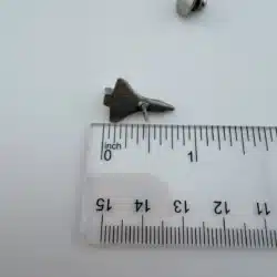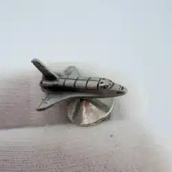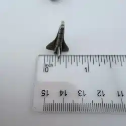 Approximately 3/4 inch in width by just over 1/2 inch in height, this NASA Space Shuttle tie tack pin features a gray shuttle design with “USA” printed on one wing and along the rear vertical stabilizer. A U.S. flag appears on the opposite wing, reflecting the official markings carried on operational orbiters.