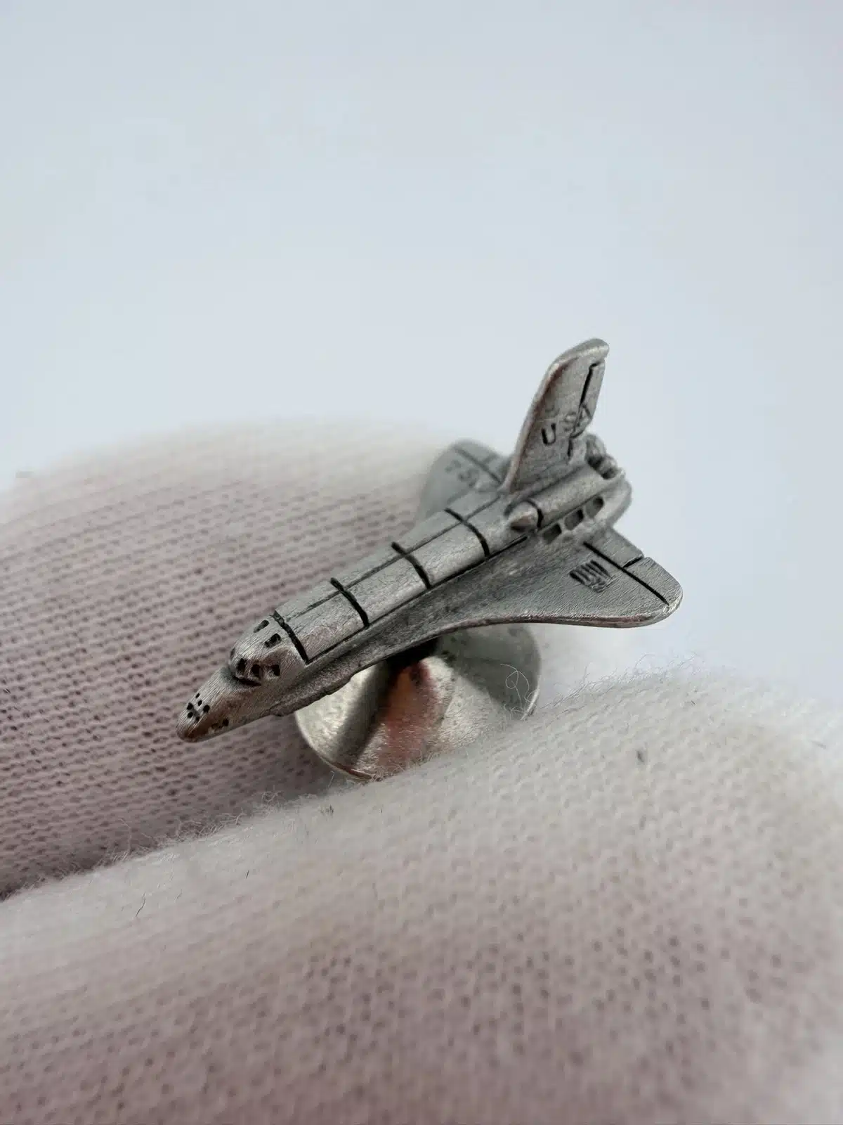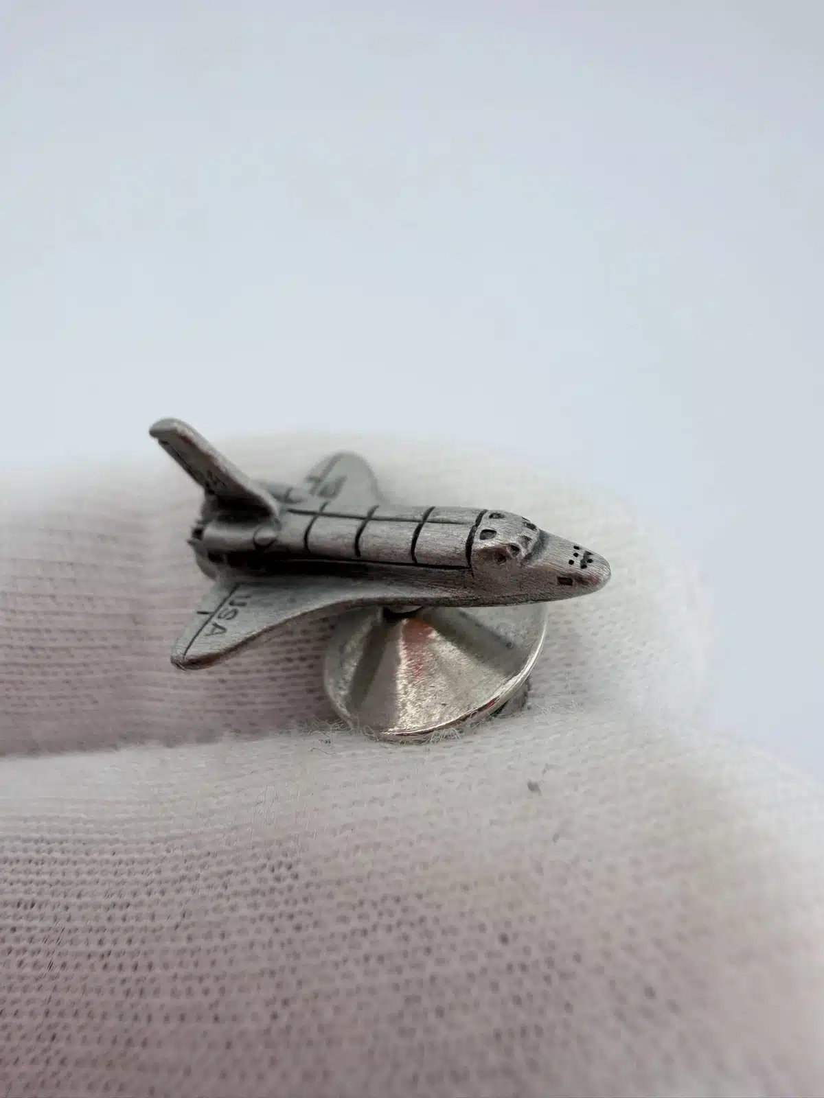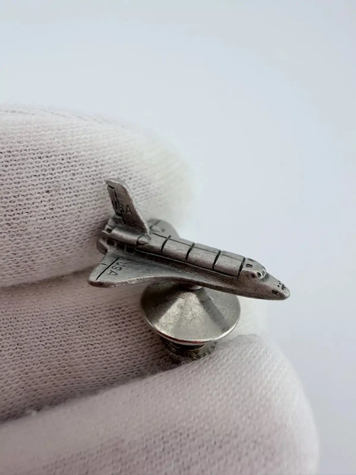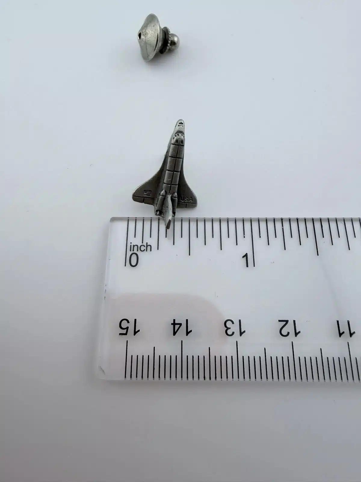 Approximately 3/4 inch in width by just over 1/2 inch in height, this NASA Space Shuttle tie tack pin features a gray shuttle design with “USA” printed on one wing and along the rear vertical stabilizer. A U.S. flag appears on the opposite wing, reflecting the official markings carried on operational orbiters.