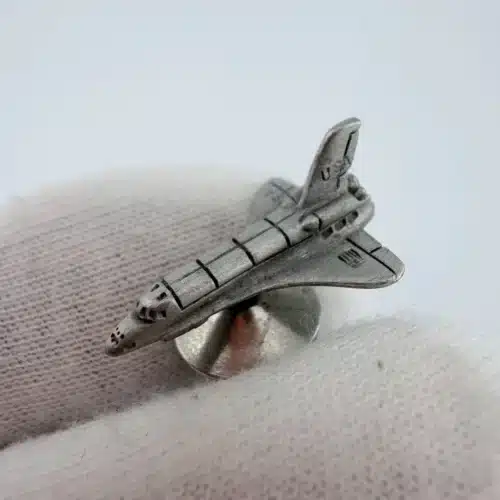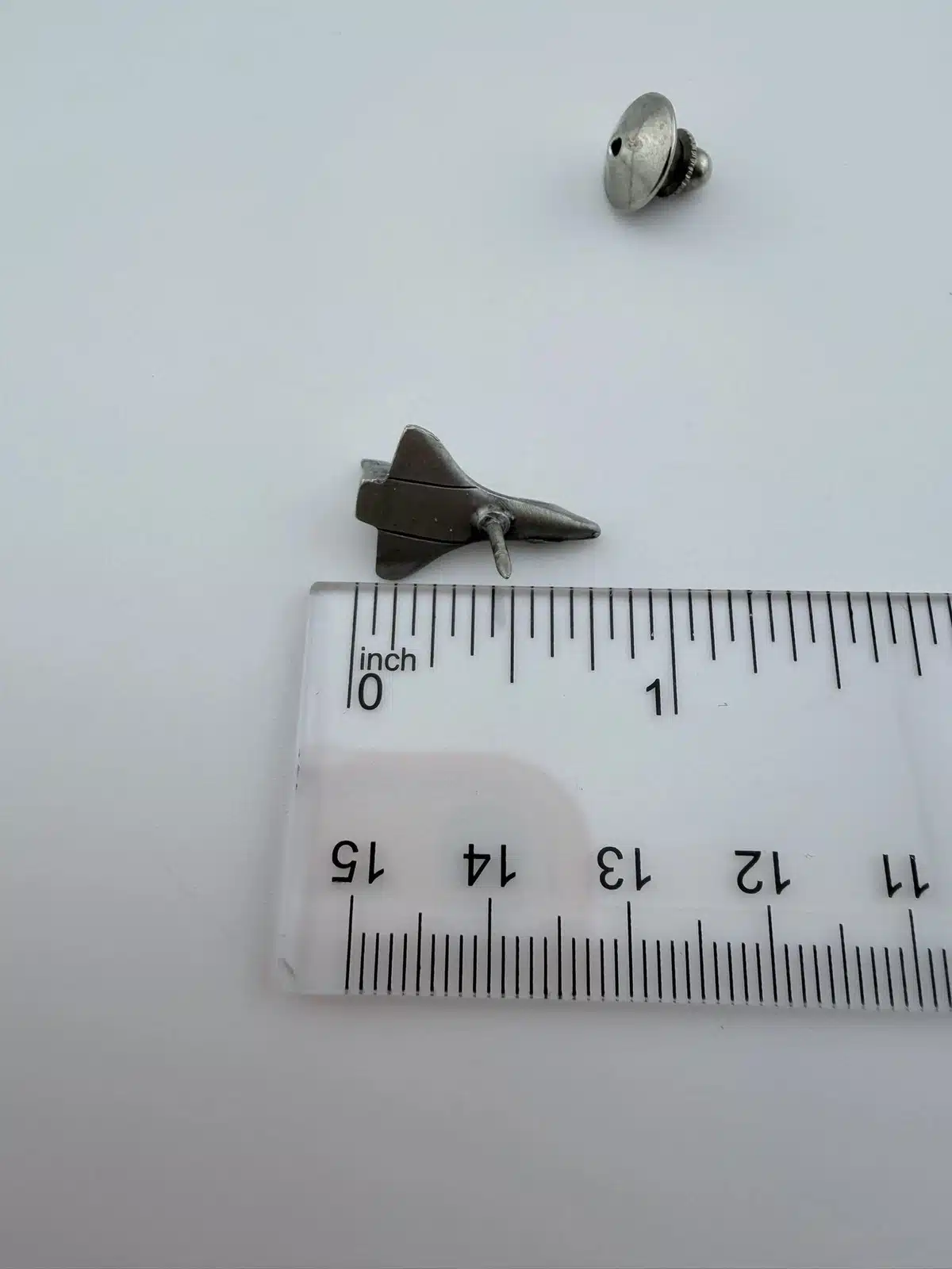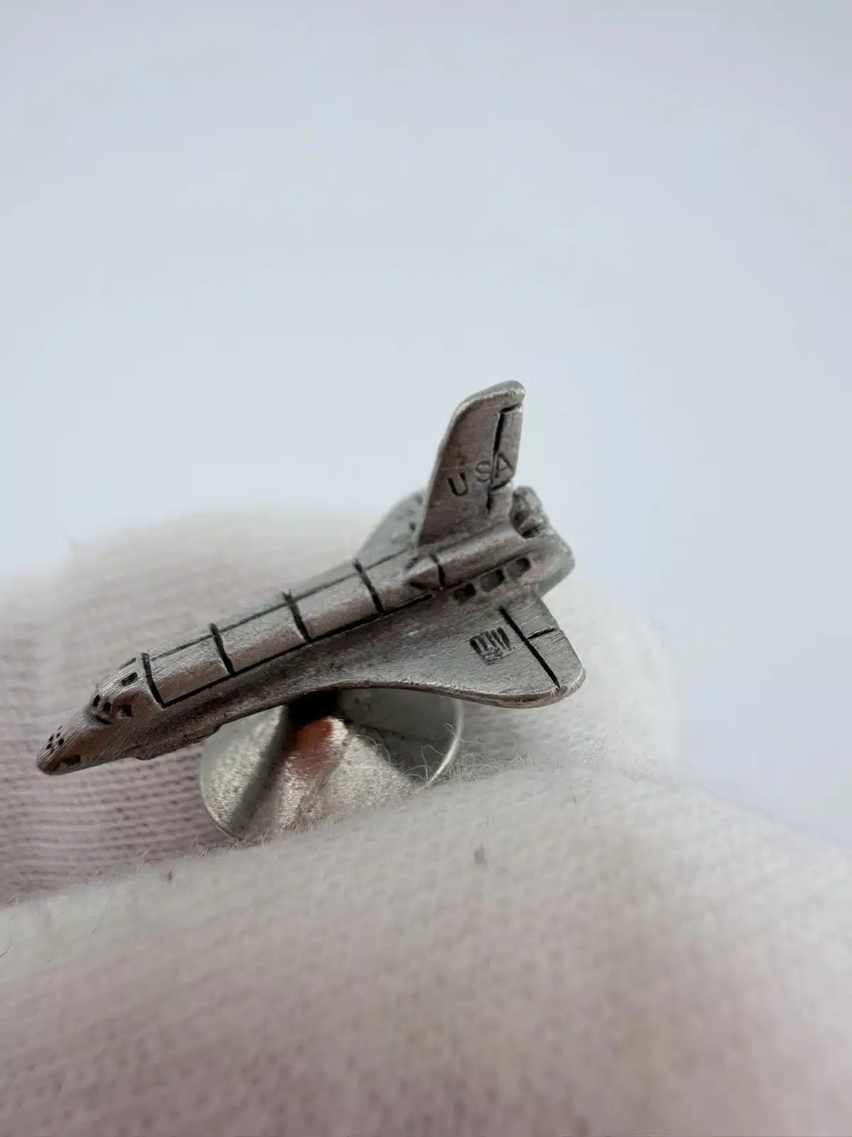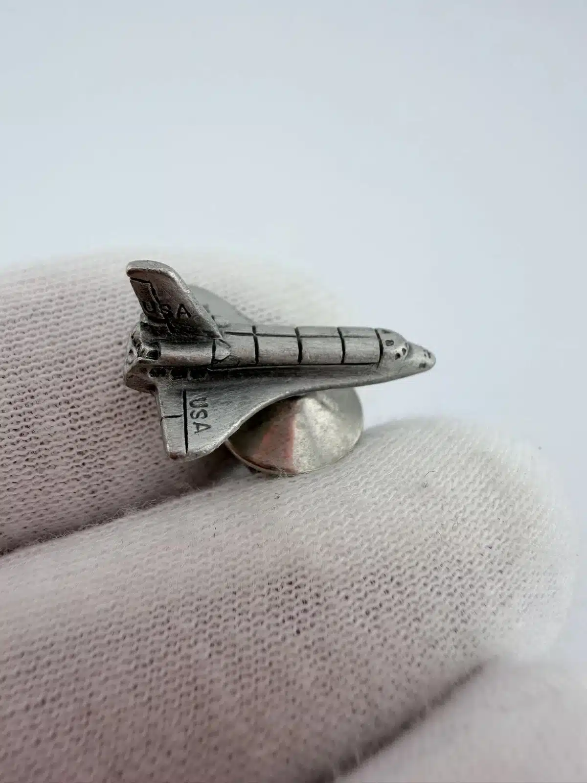 Approximately 3/4 inch in width by just over 1/2 inch in height, this NASA Space Shuttle tie tack pin features a gray shuttle design with “USA” printed on one wing and along the rear vertical stabilizer. A U.S. flag appears on the opposite wing, reflecting the official markings carried on operational orbiters.