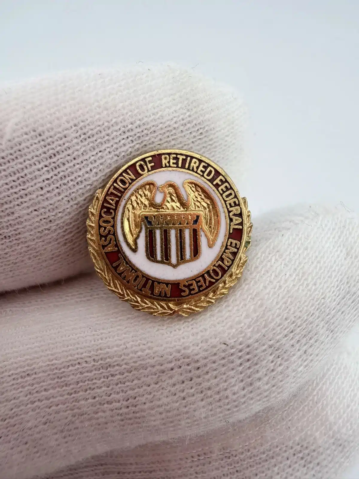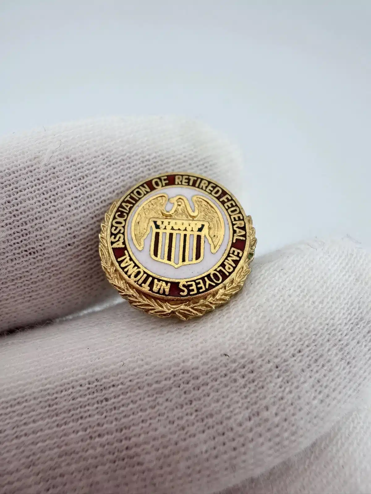 This National Association Of Retired Federal Employees pin features a circular design with a gold tone laurel wreath surrounding the outer edge. The red ring reads “National Association Of Retired Federal Employees,” framing the central NARFE emblem.