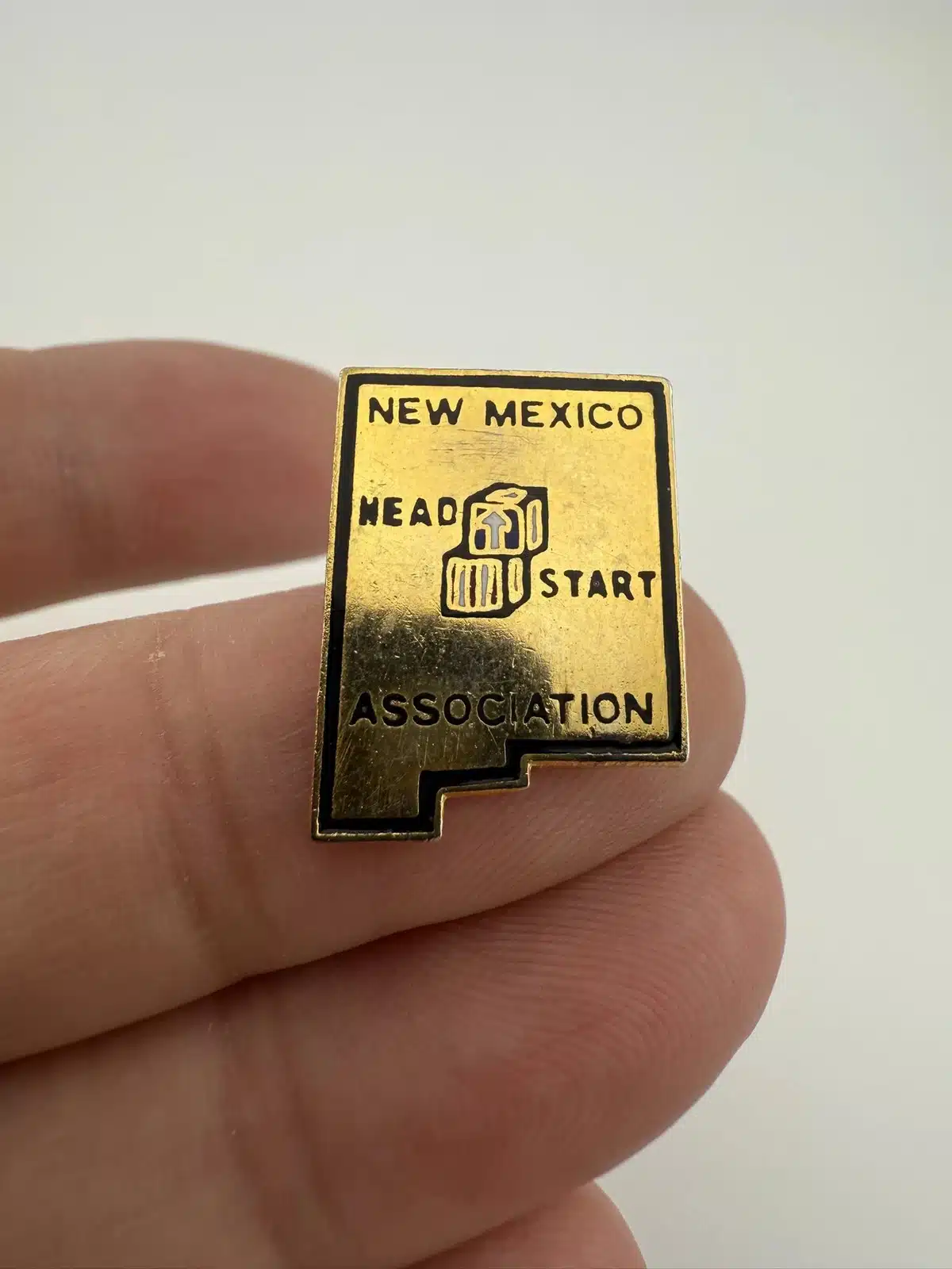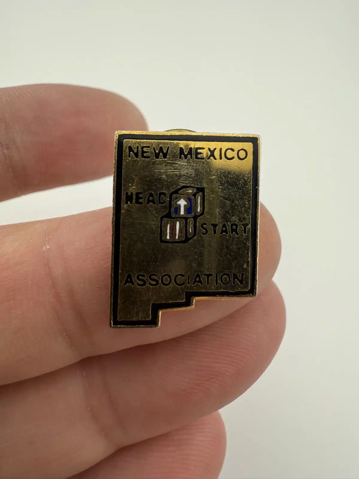 The New Mexico Head Start Association pin is shaped like the state of New Mexico. This collectible piece represents the commitment to early childhood education of the Head Start program.