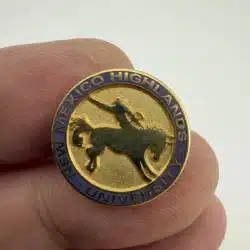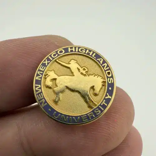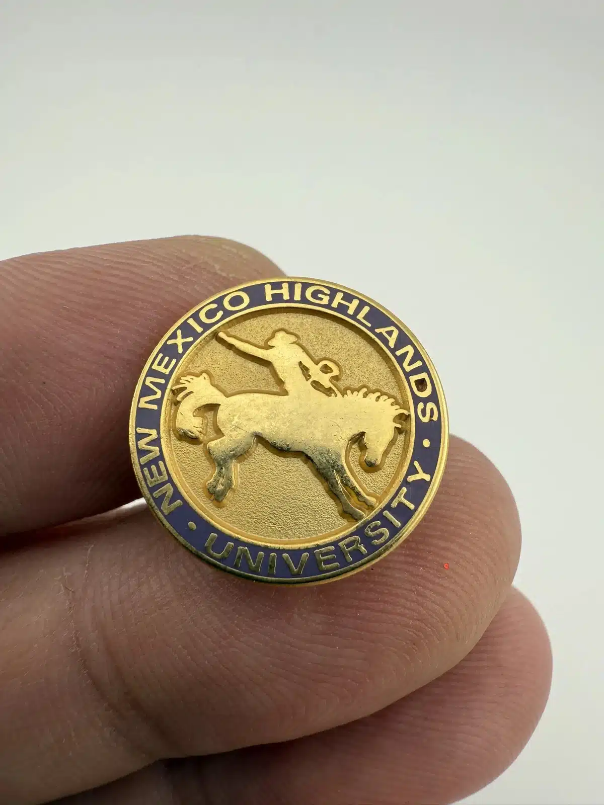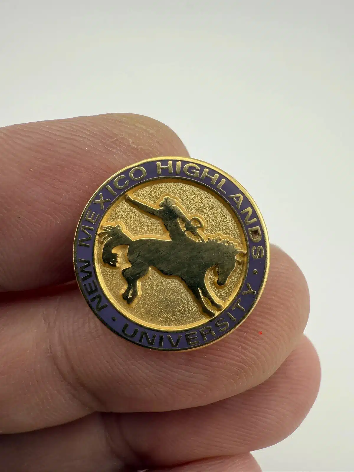 This pin features a striking design of a cowboy on horseback, expertly rendered in gold tone and surrounded by purple enamel. It represents New Mexico Highlands University, an institution known for its rich cultural heritage and connection to the American West.