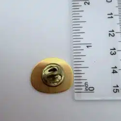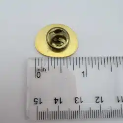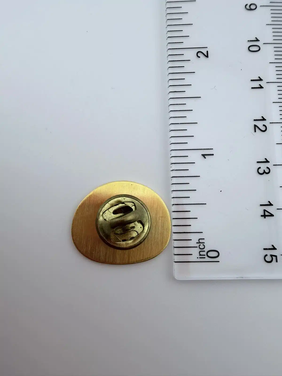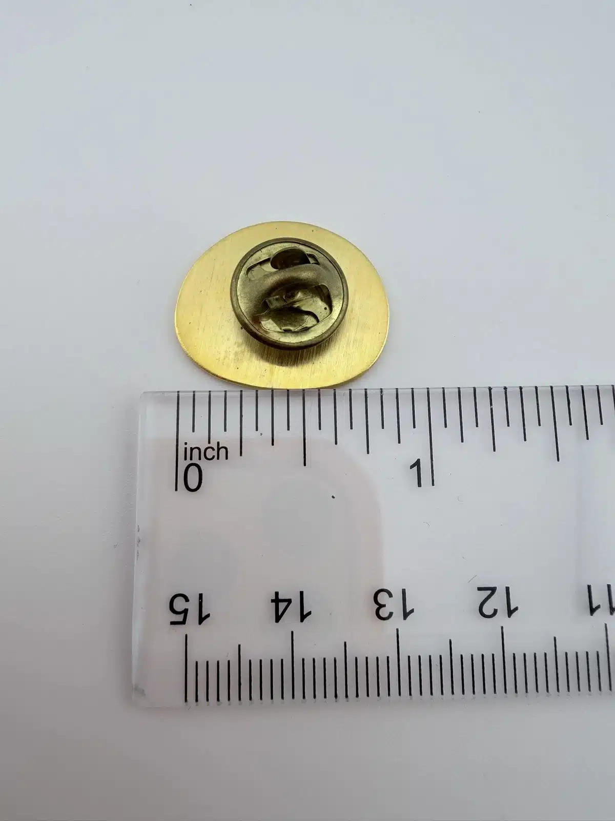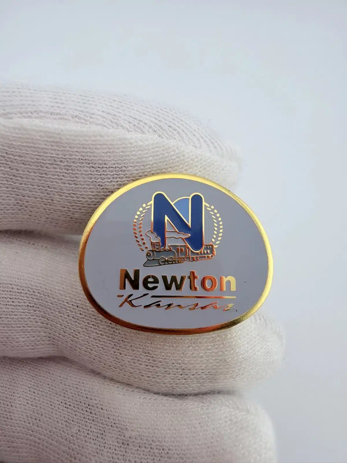 Newton Kansas train travel souvenir pin features a gold tone design measuring just over 3/4 inch in width by just under 3/4 inch in height. The design showcases a large blue letter “N” above a grey steam train releasing exhaust from its stack, with “Newton Kansas” displayed below.