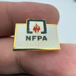 The National Fire Protection Association (NFPA) is an international nonprofit organization founded in 1896 that develops fire safety codes and standards used worldwide. Pin measures approximately 3/4 inch in width by just over 1/2 inch in height.