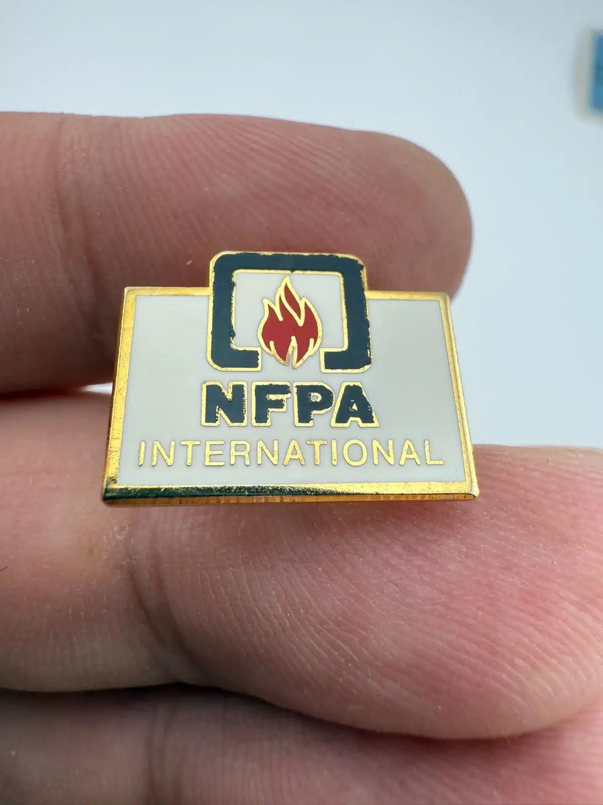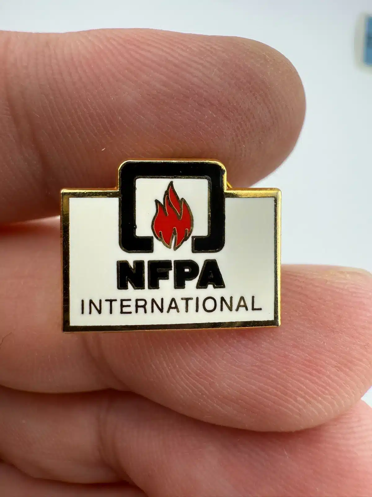 The National Fire Protection Association (NFPA) is an international nonprofit organization founded in 1896 that develops fire safety codes and standards used worldwide. Pin measures approximately 3/4 inch in width by just over 1/2 inch in height.