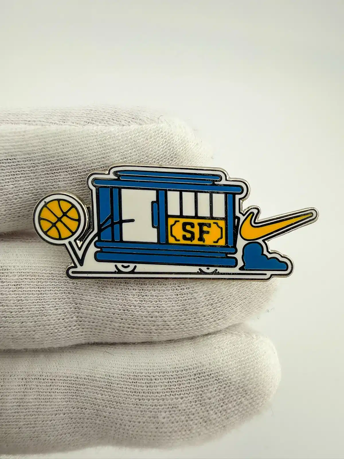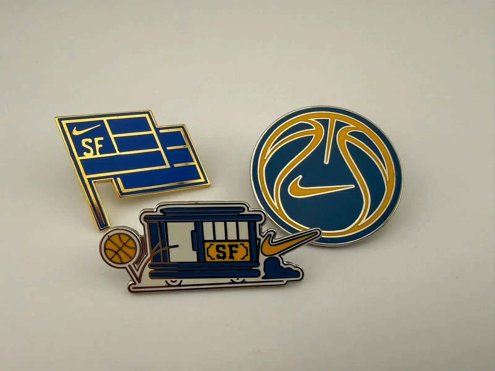 This three-pin set was designed by Dynamic Dynosaur Studio for Nike as part of the USA Basketball Tour and was distributed at select flagship store events. The group includes a San Francisco flag pin featuring a Nike swoosh and the letters SF, a basketball-shaped pin with a clean swoosh-only design, and a standout San Francisco cable car pin with a basketball shown passing through the cable car entrance. Please note that this is not a complete set, but it remains a distinctive and visually engaging example of Nike’s event-exclusive promotional designs.