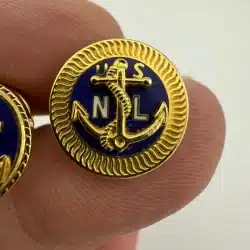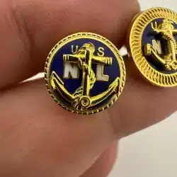 This set includes two circular pins, each featuring a raised anchor design with the letters “US” above and the letters “N” and “L” positioned within the open space of the anchor below. Both share a consistent layout, with slight variation in size between the two pieces.