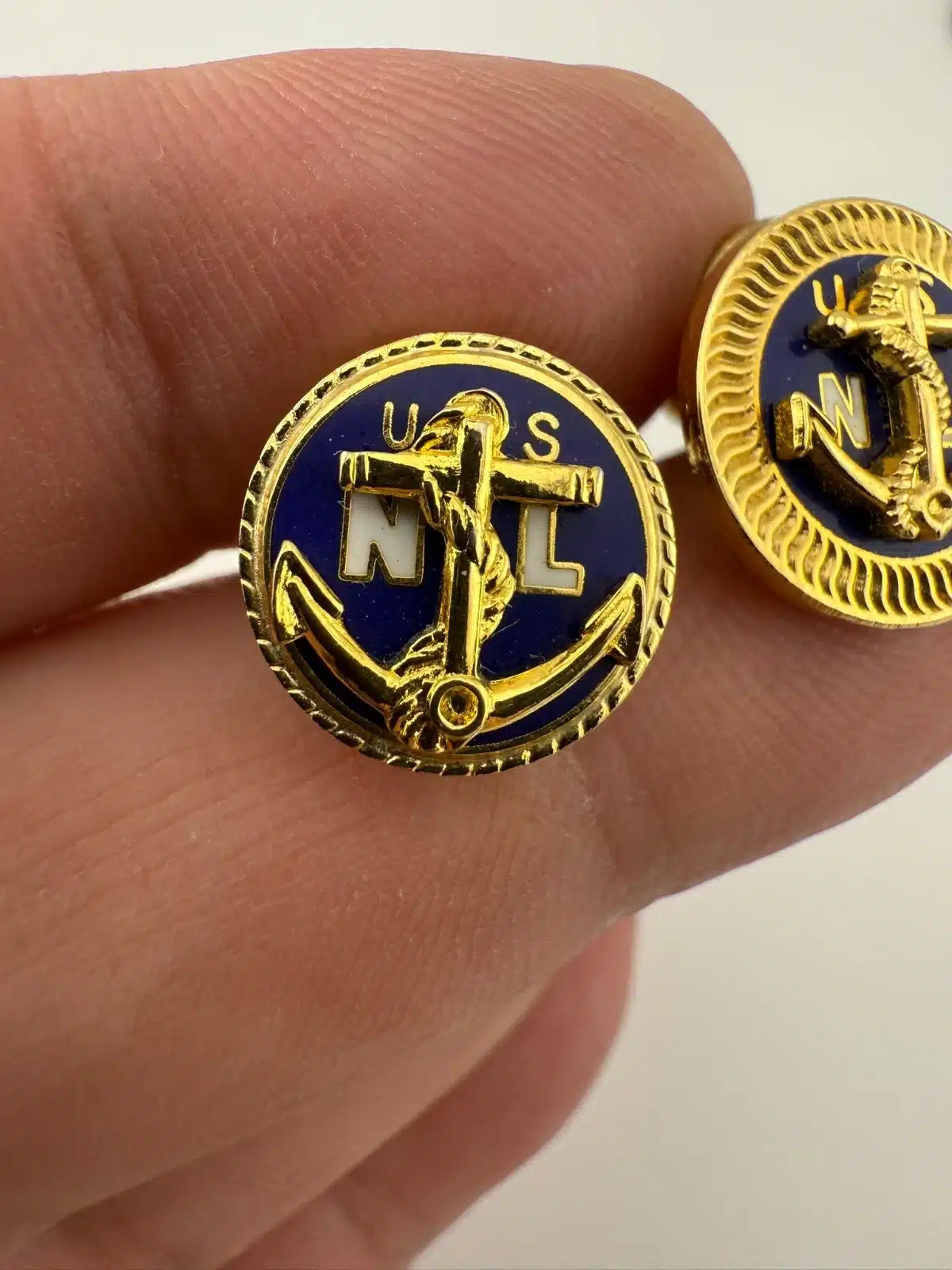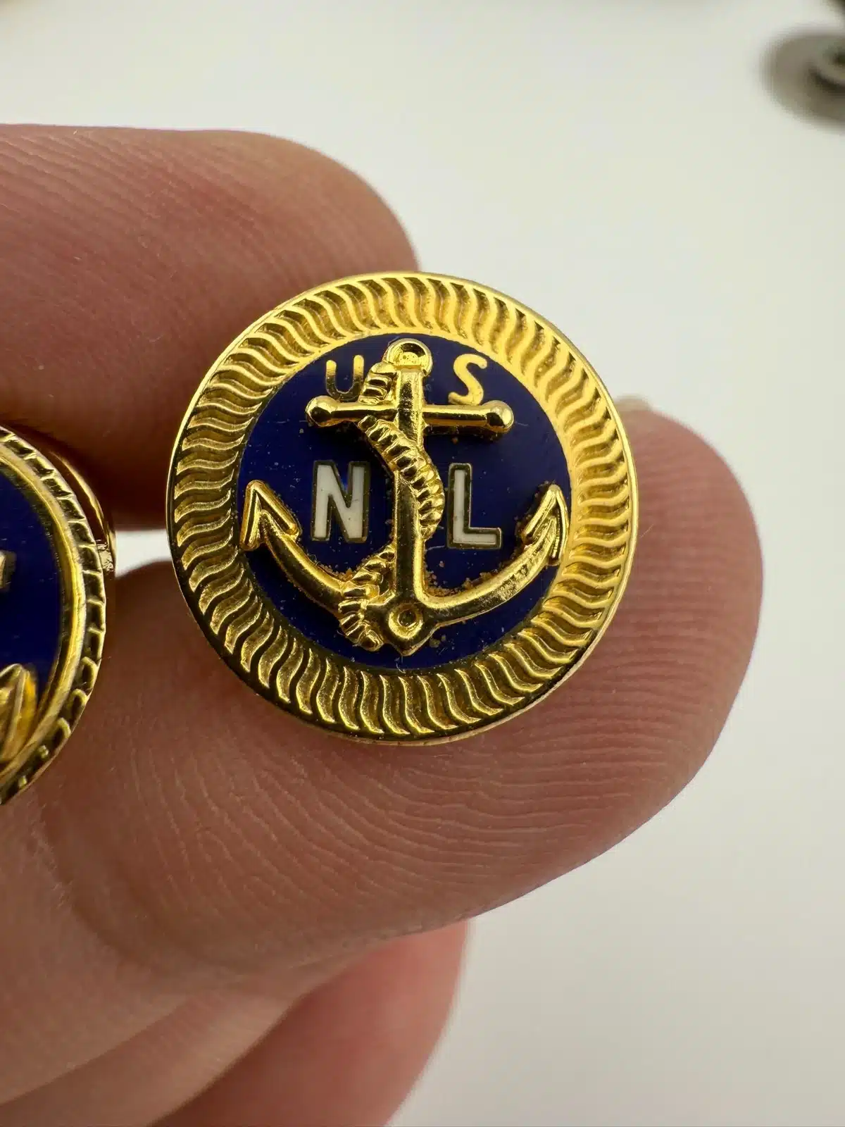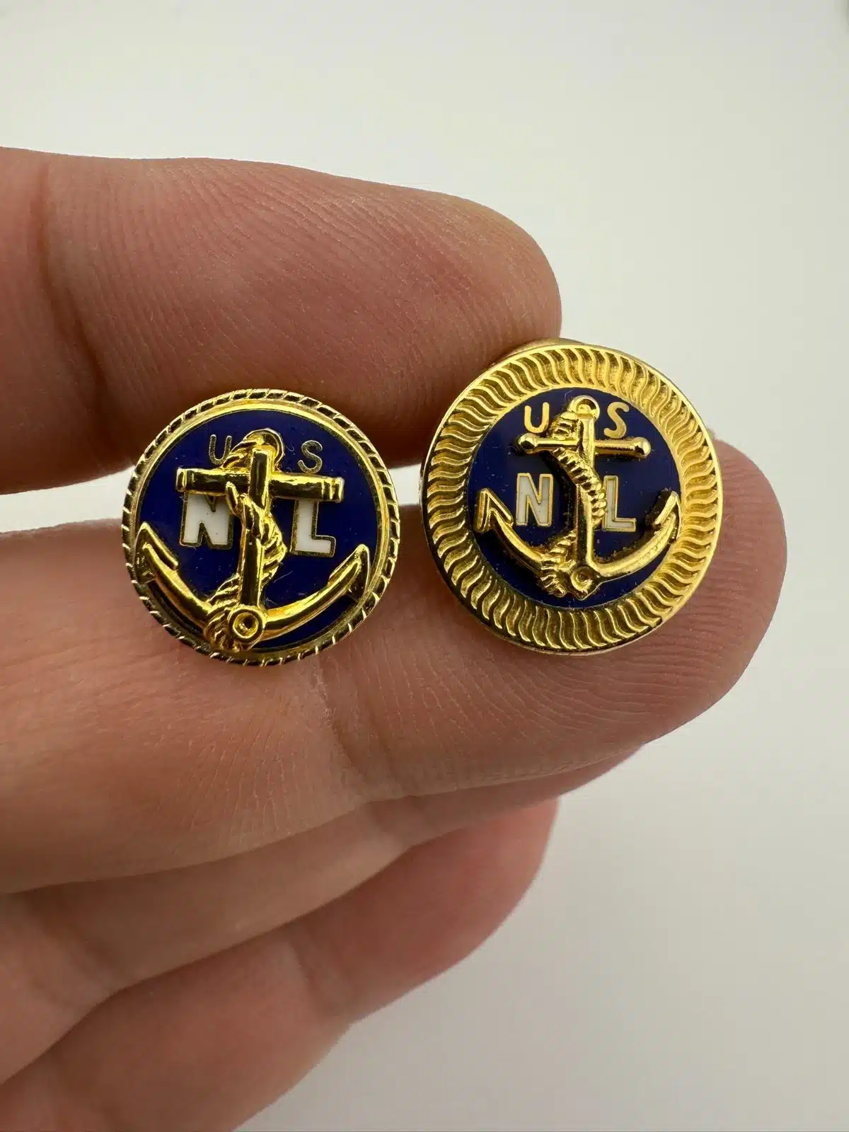 This set includes two circular pins, each featuring a raised anchor design with the letters “US” above and the letters “N” and “L” positioned within the open space of the anchor below. Both share a consistent layout, with slight variation in size between the two pieces.