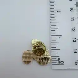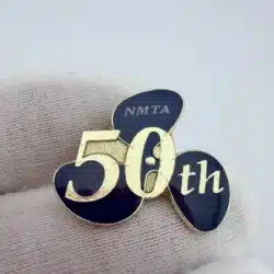 This NMTA Northwest Marine Trade Association 50th Anniversary pin is shaped like a ship’s propeller with three blades in a gold tone finish. The top blade reads “NMTA”, while the two lower blades together display “50th”. The reverse of the pin is marked “1997”. Pin measures approximately 1 inch in width by just over 3/4 inches in height.