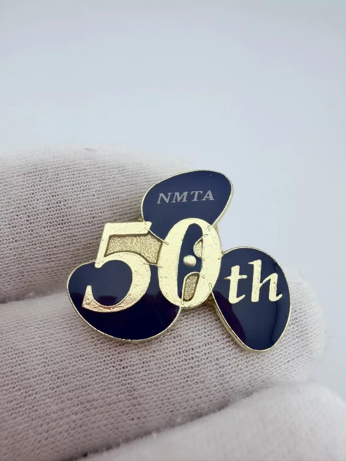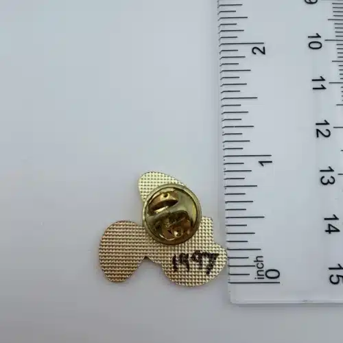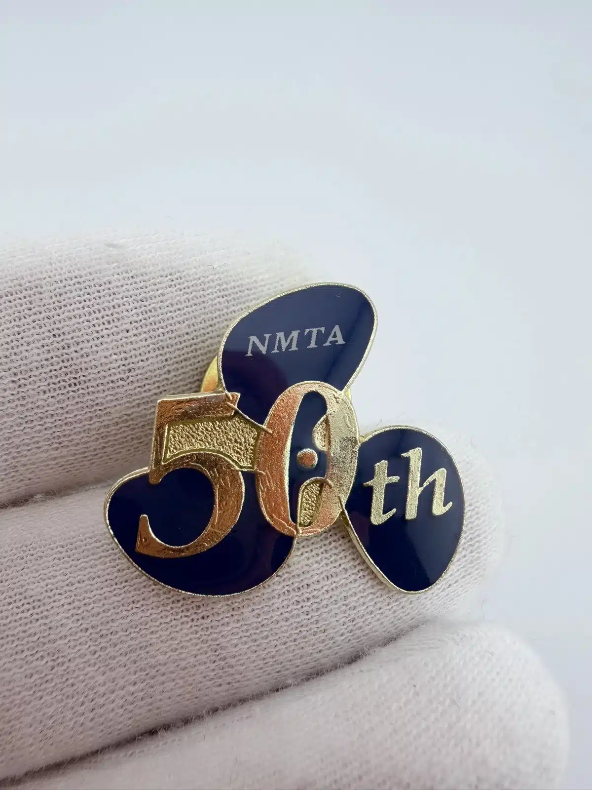 This NMTA Northwest Marine Trade Association 50th Anniversary pin is shaped like a ship’s propeller with three blades in a gold tone finish. The top blade reads “NMTA”, while the two lower blades together display “50th”. The reverse of the pin is marked “1997”. Pin measures approximately 1 inch in width by just over 3/4 inches in height.