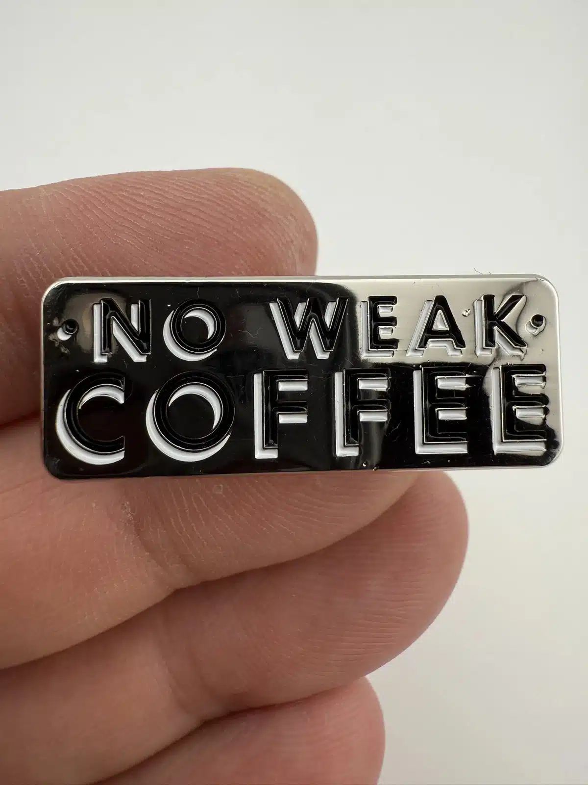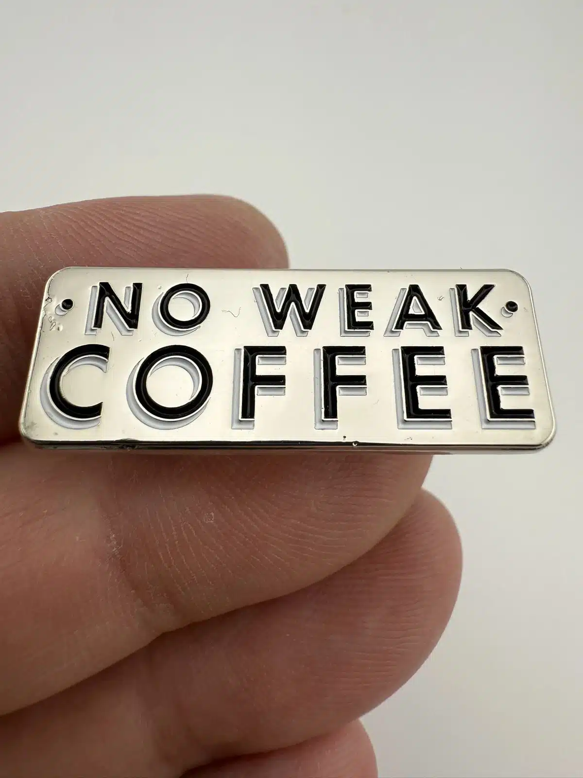 This ‘NO WEAK COFFEE’ lapel hat pin features a bold design that emphasizes a strong coffee culture.