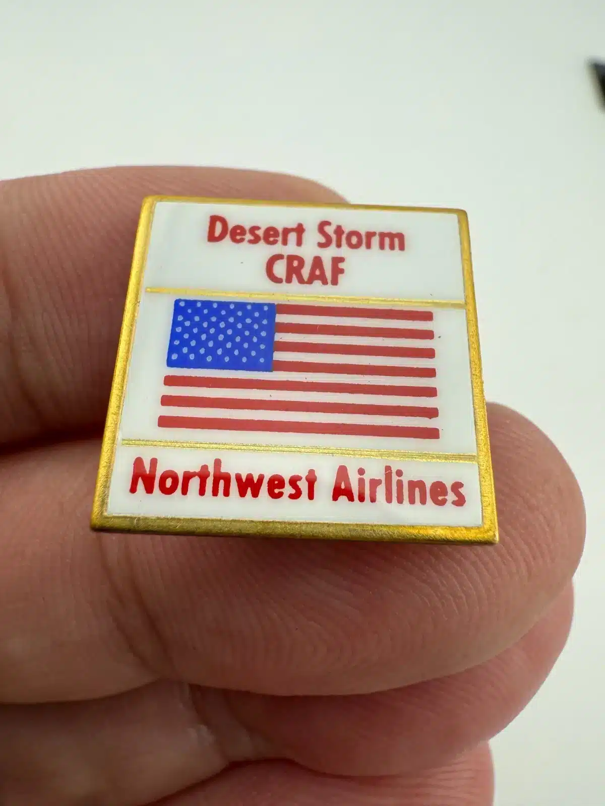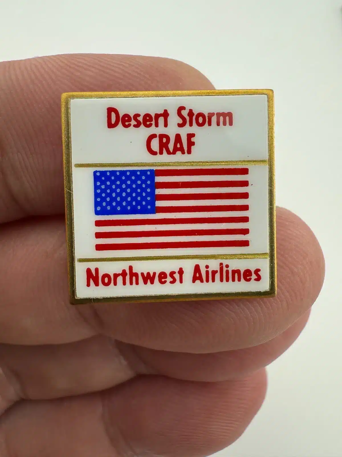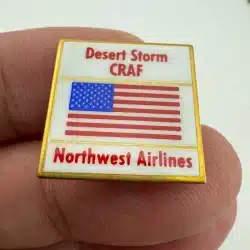 This pin features the Northwest Airlines logo alongside the American flag, symbolizing the airline’s involvement in the Civil Reserve Air Fleet (CRAF) during Operation Desert Storm.