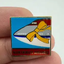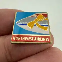 This Northwest Airlines pin features the frontend of one of their airplanes adorned with a vibrant yellow ribbon, symbolizing support for military personnel during the Gulf War.