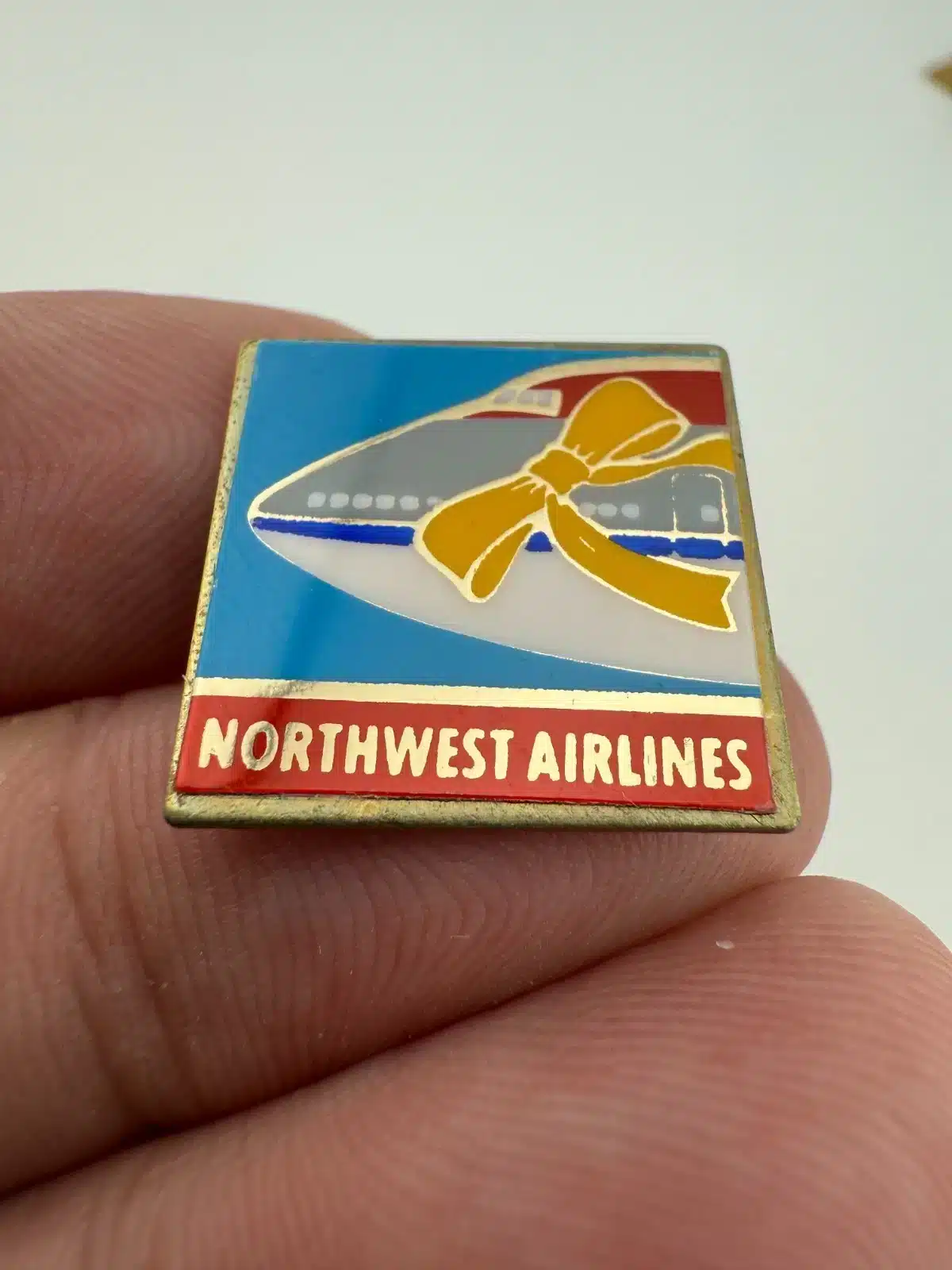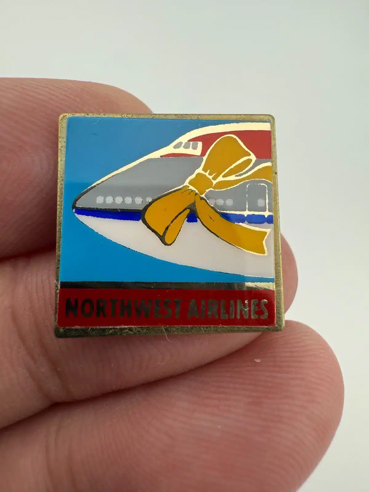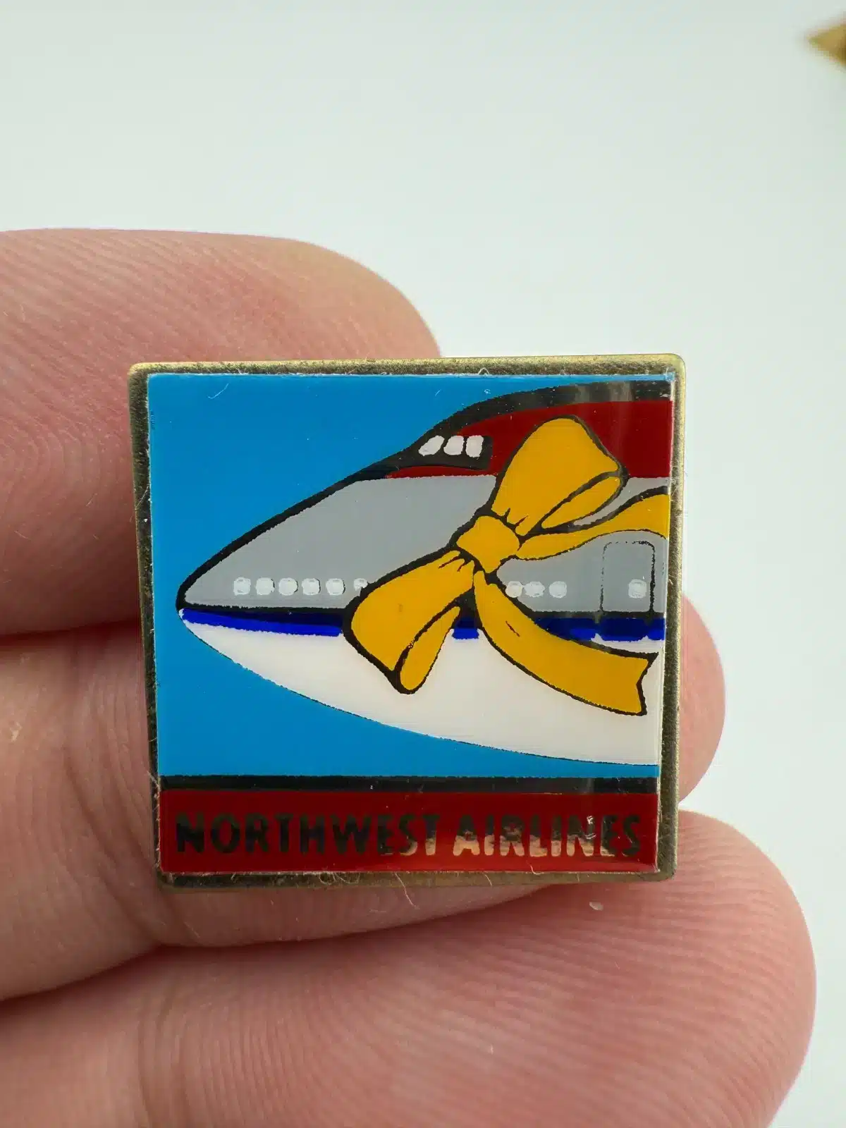 This Northwest Airlines pin features the frontend of one of their airplanes adorned with a vibrant yellow ribbon, symbolizing support for military personnel during the Gulf War.
