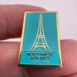 This pin commemorates Northwest Airlines’ newly added service to Paris in 1989, featuring a detailed depiction of the iconic Eiffel Tower.