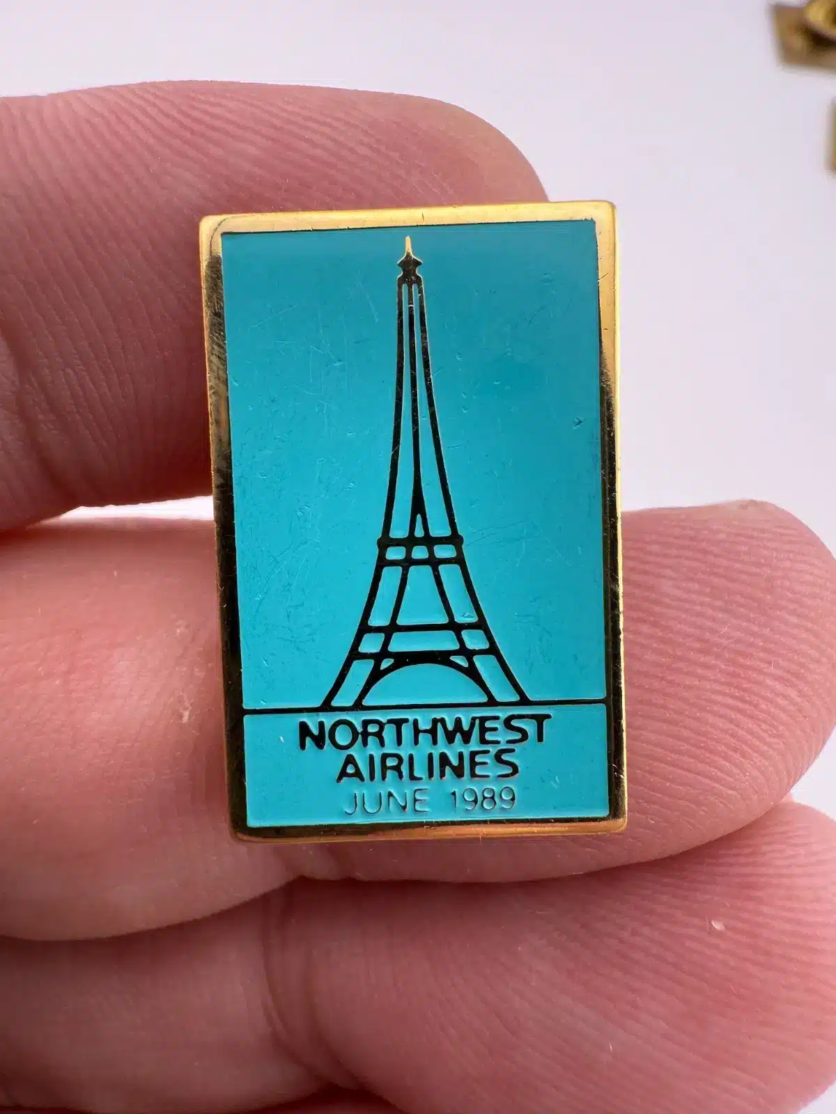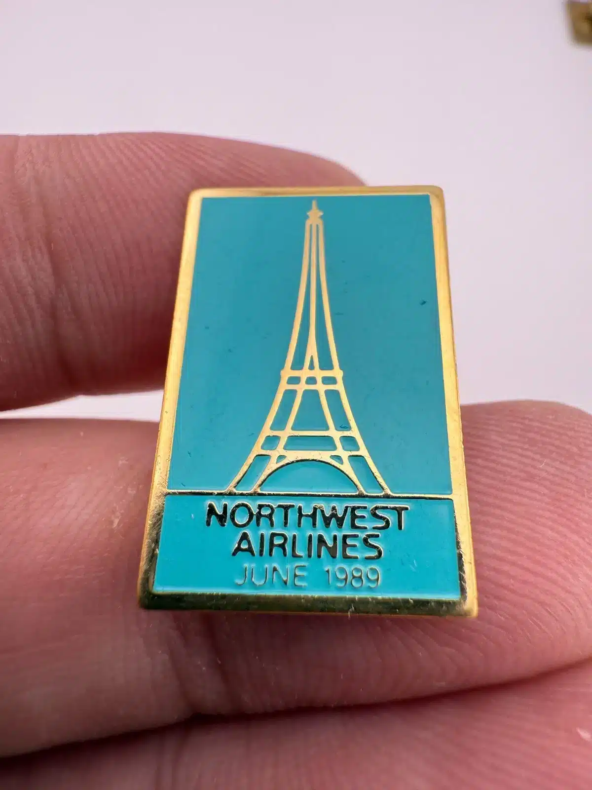 This pin commemorates Northwest Airlines’ newly added service to Paris in 1989, featuring a detailed depiction of the iconic Eiffel Tower.