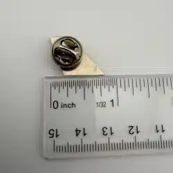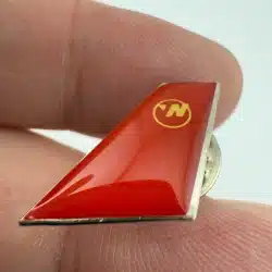 This pin is shaped like the vertical tail of an airplane and features a red background. Centered on the top part of the tail is the Northwest Airlines logo with a circular design incorporating a directional arrow and the letter “N”. Pin measures approximately 3/4 inches in width by 5/8 inches in height.