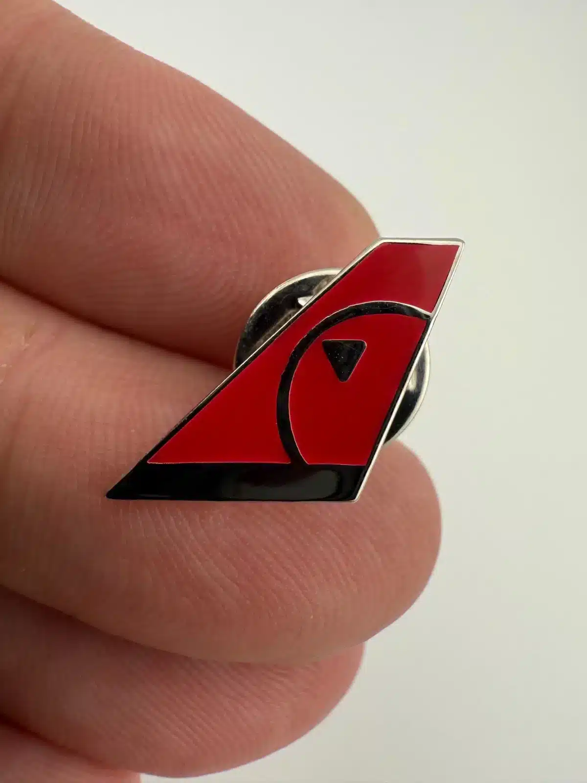 Northwest Airlines plane tail pin features a stylized aircraft tail section with a red tail and the airline’s distinctive circle and arrow logo. The silver tone design reflects the classic Northwest Airlines tail branding used for decades across the carrier’s fleet.