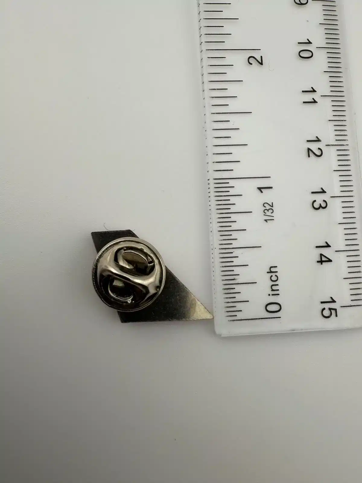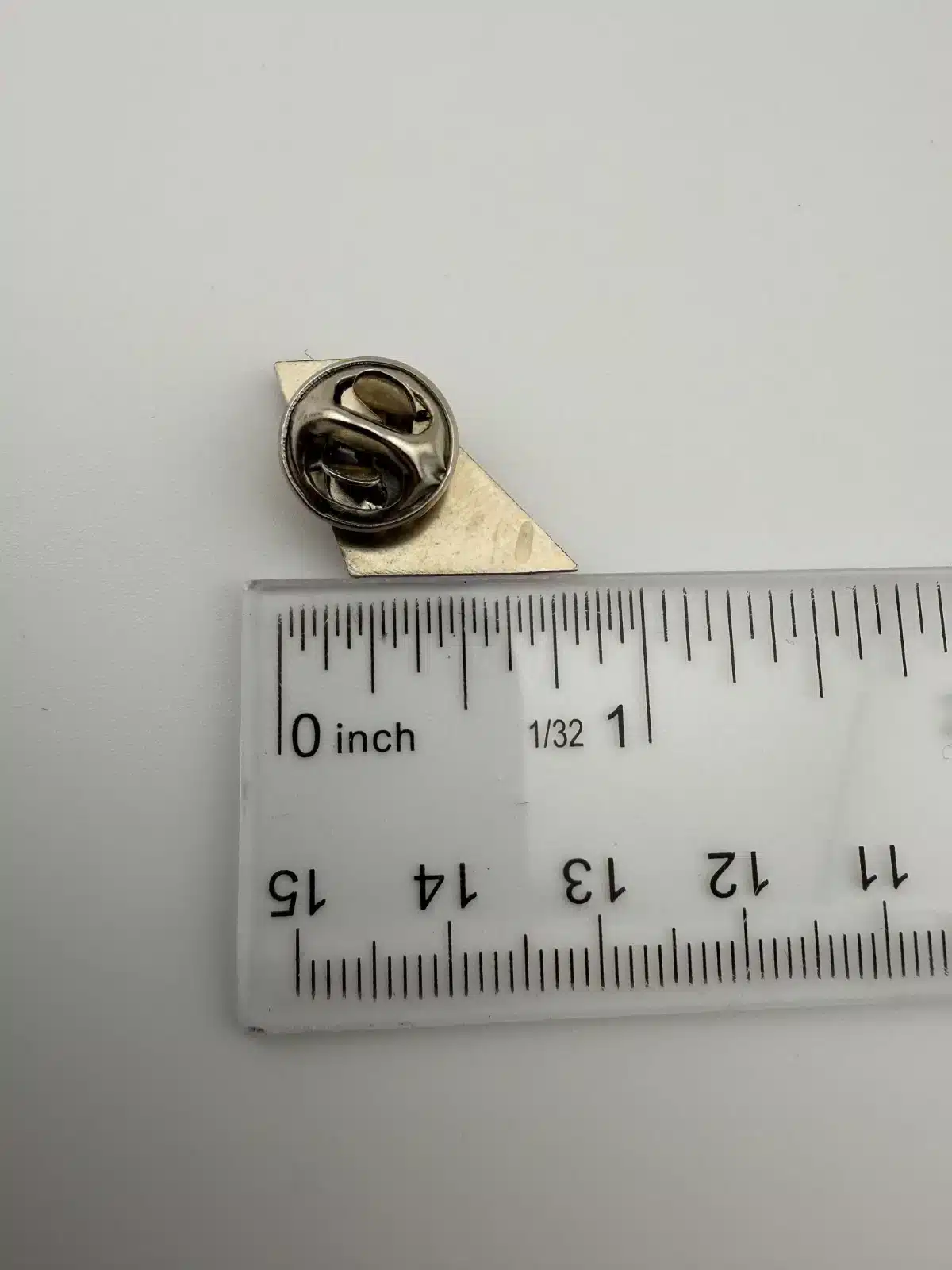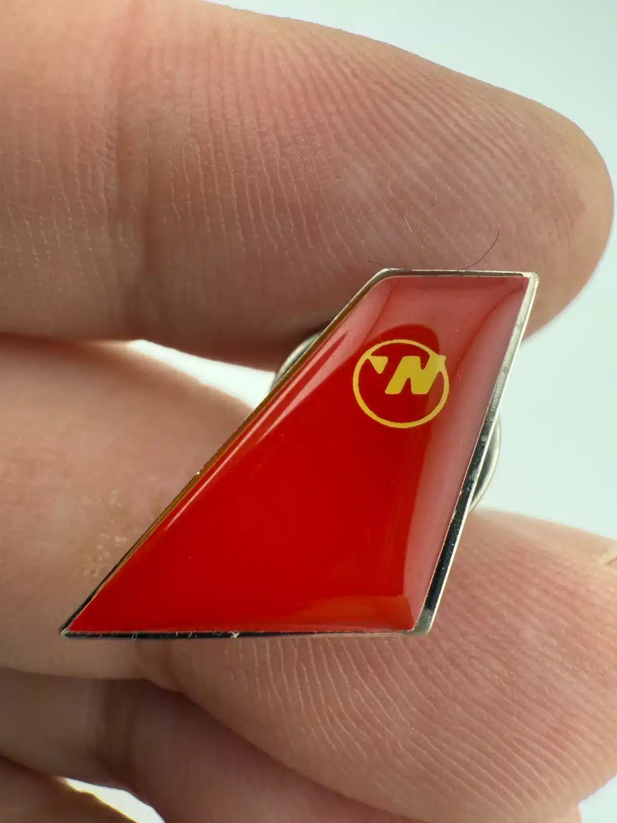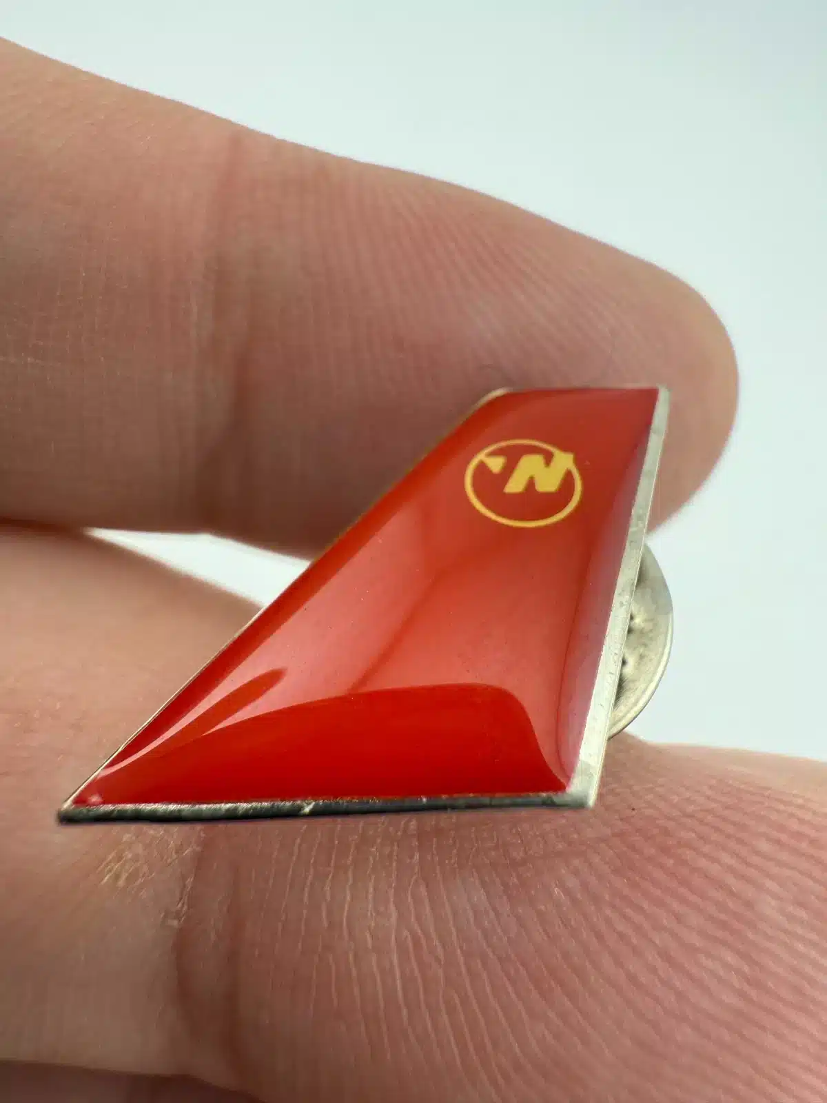 This pin is shaped like the vertical tail of an airplane and features a red background. Centered on the top part of the tail is the Northwest Airlines logo with a circular design incorporating a directional arrow and the letter “N”. Pin measures approximately 3/4 inches in width by 5/8 inches in height.