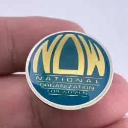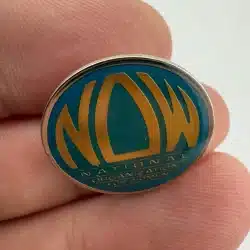 This pin features the NOW logo, which consists of bold, capitalized letters in a striking design, symbolizing the National Organization for Women’s commitment to women’s rights and equality. Founded in 1966, NOW has played a pivotal role in advocating for women across the United States.