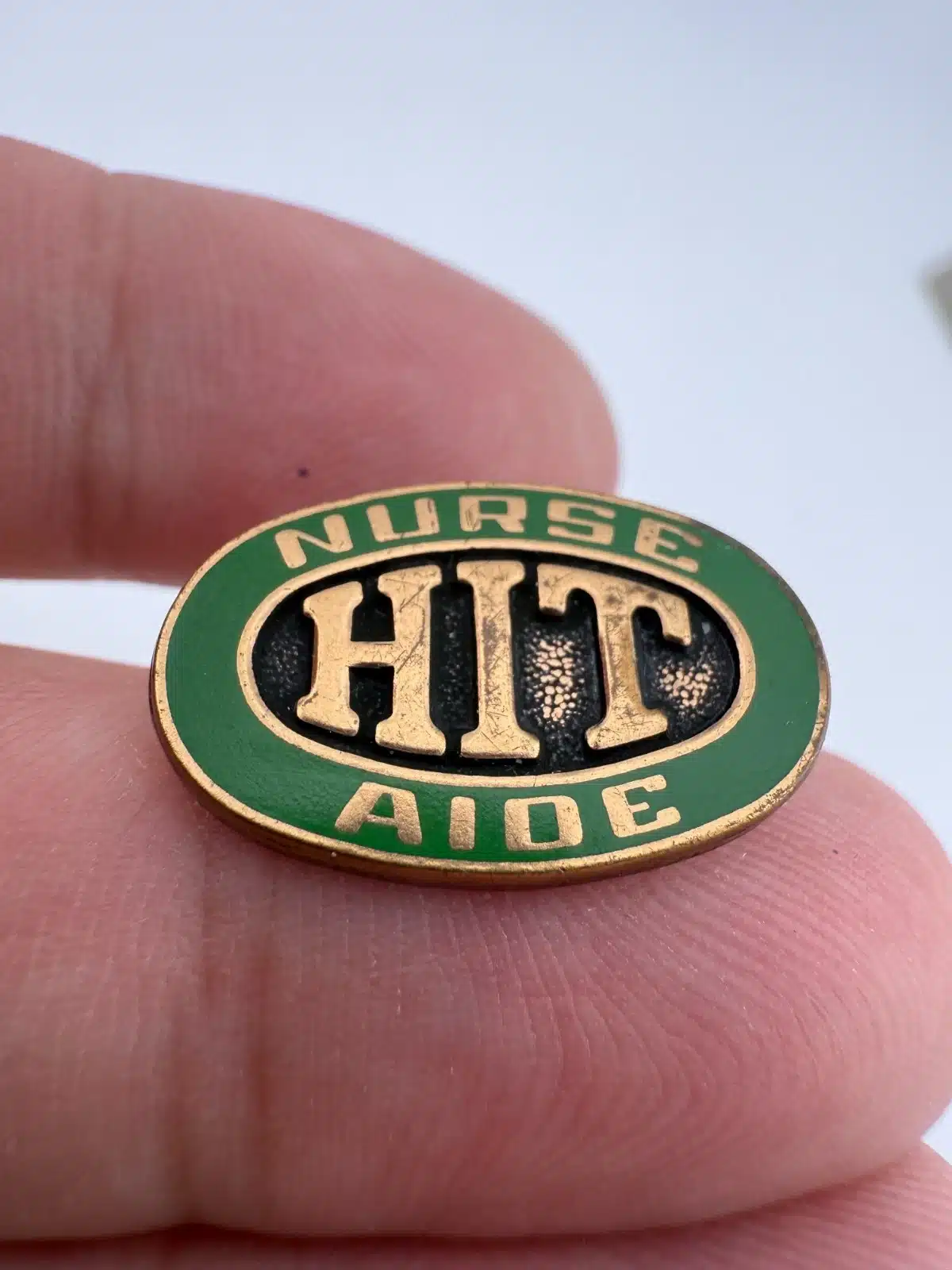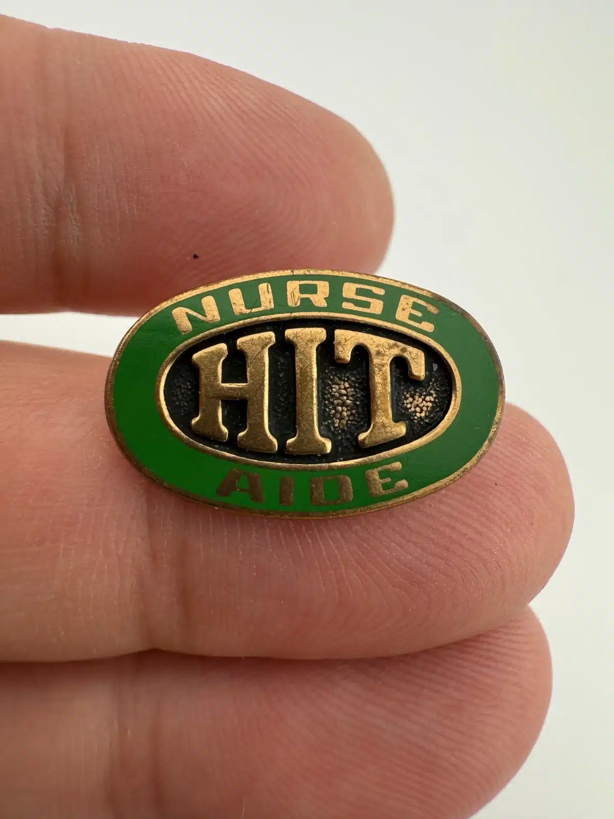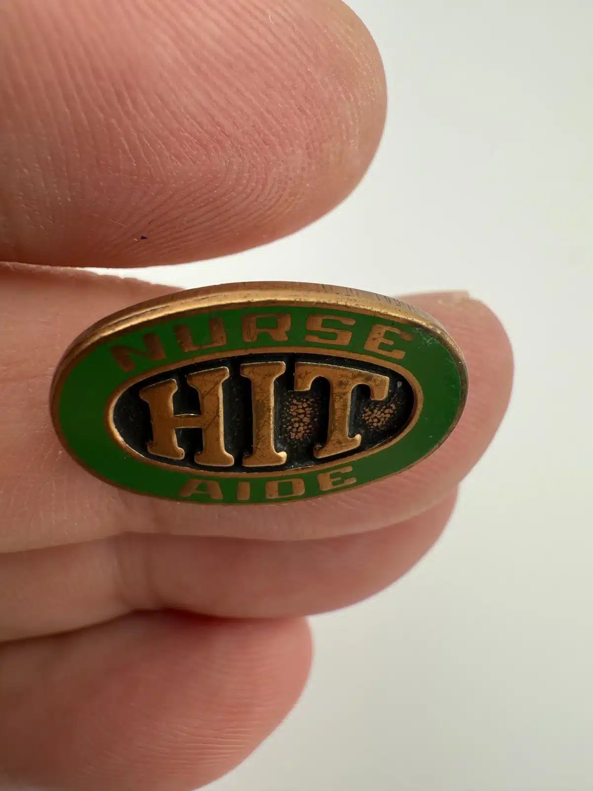 Unknown green enamel and gold tone nursing pin that reads “Nurse Aide HIT.” HIT possibly stands for Health Information Technology.