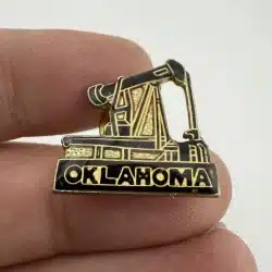 This Oklahoma Oil Field Pump Jack Pin features a detailed representation of a classic pump jack, symbolizing the state’s rich oil heritage.