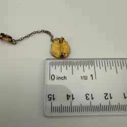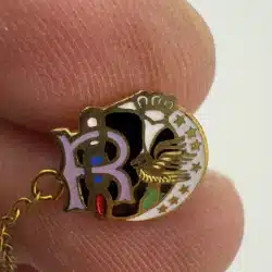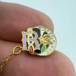 Used with marks including small crack in letter R enamel, corrosion on smaller attach pin (3-piece chain part), and other various marks. Please see all photos for exact condition of item and size.