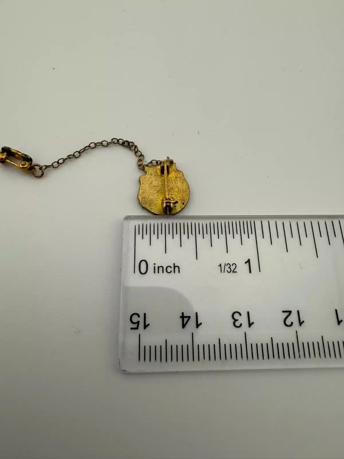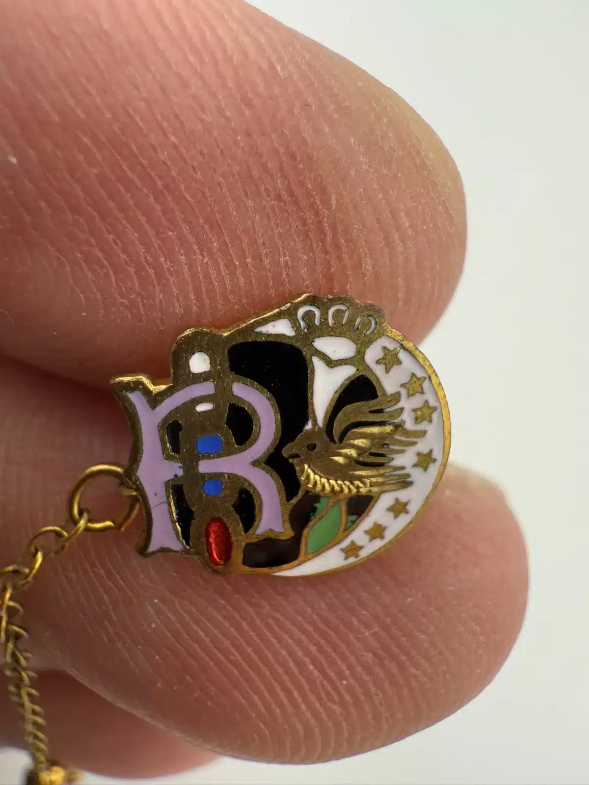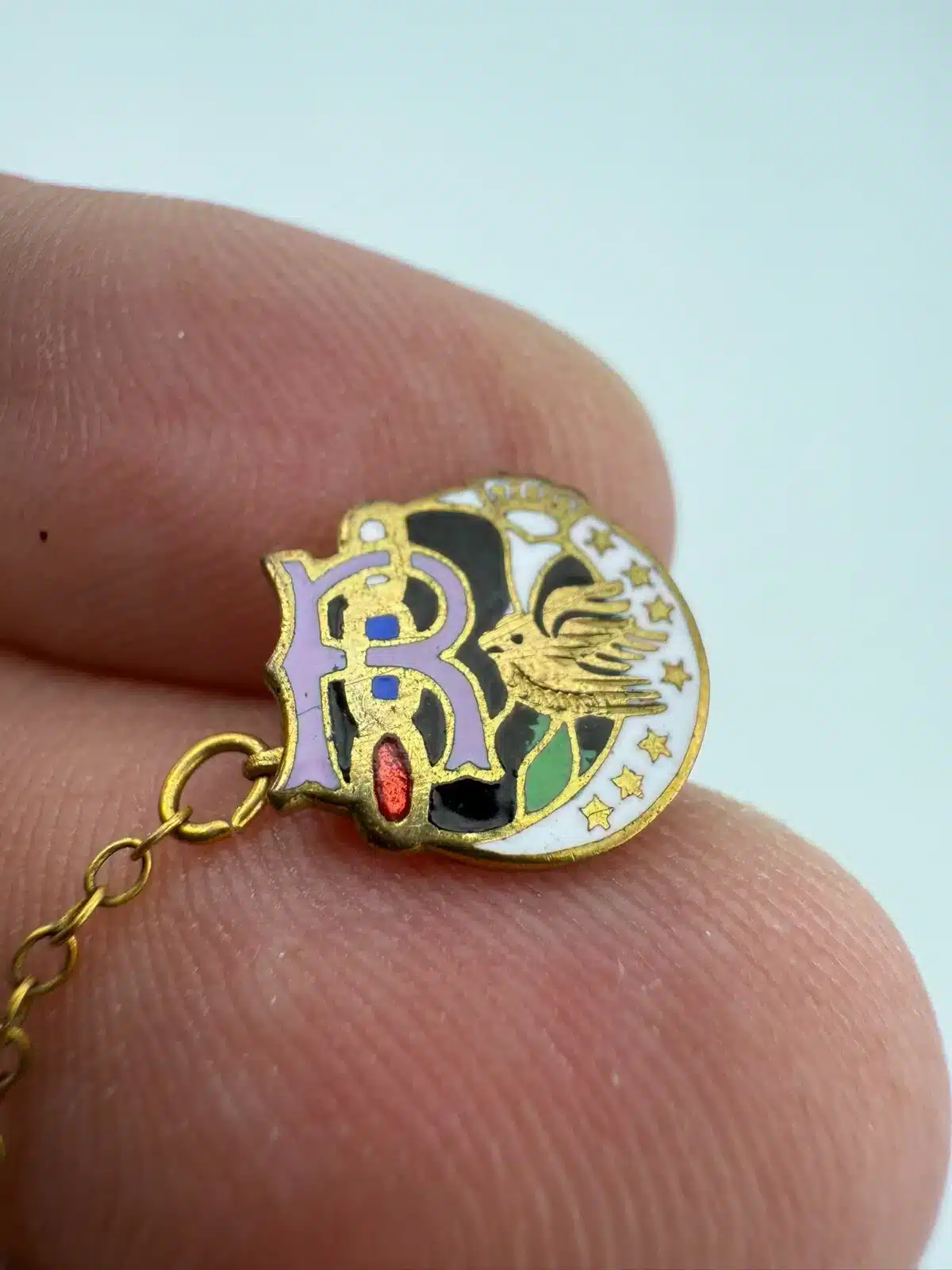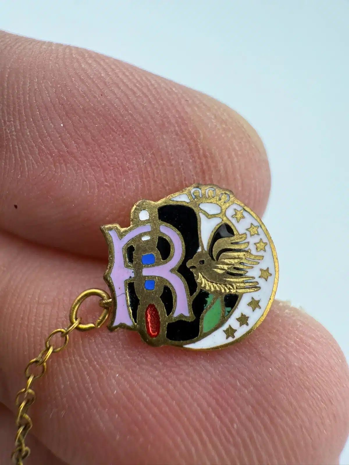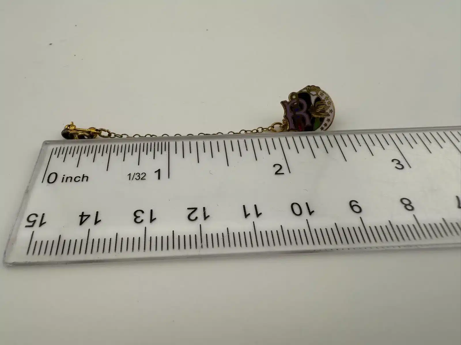 Used with marks including small crack in letter R enamel, corrosion on smaller attach pin (3-piece chain part), and other various marks. Please see all photos for exact condition of item and size.
