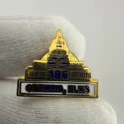 This gold tone pin features a detailed depiction of the Washington State Capitol, prominently displaying the number ‘186’ to signify the Elks Lodge #186 in Olympia. Below the Capitol, the words ‘OLYMPIA ELKS’ are elegantly inscribed, highlighting the lodge’s connection to the local community.