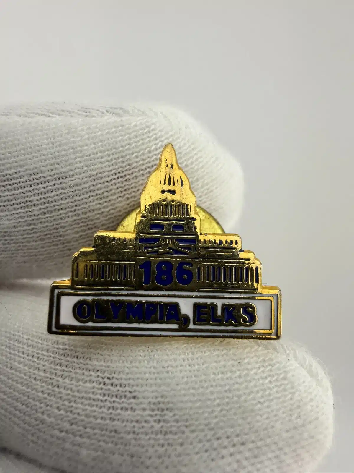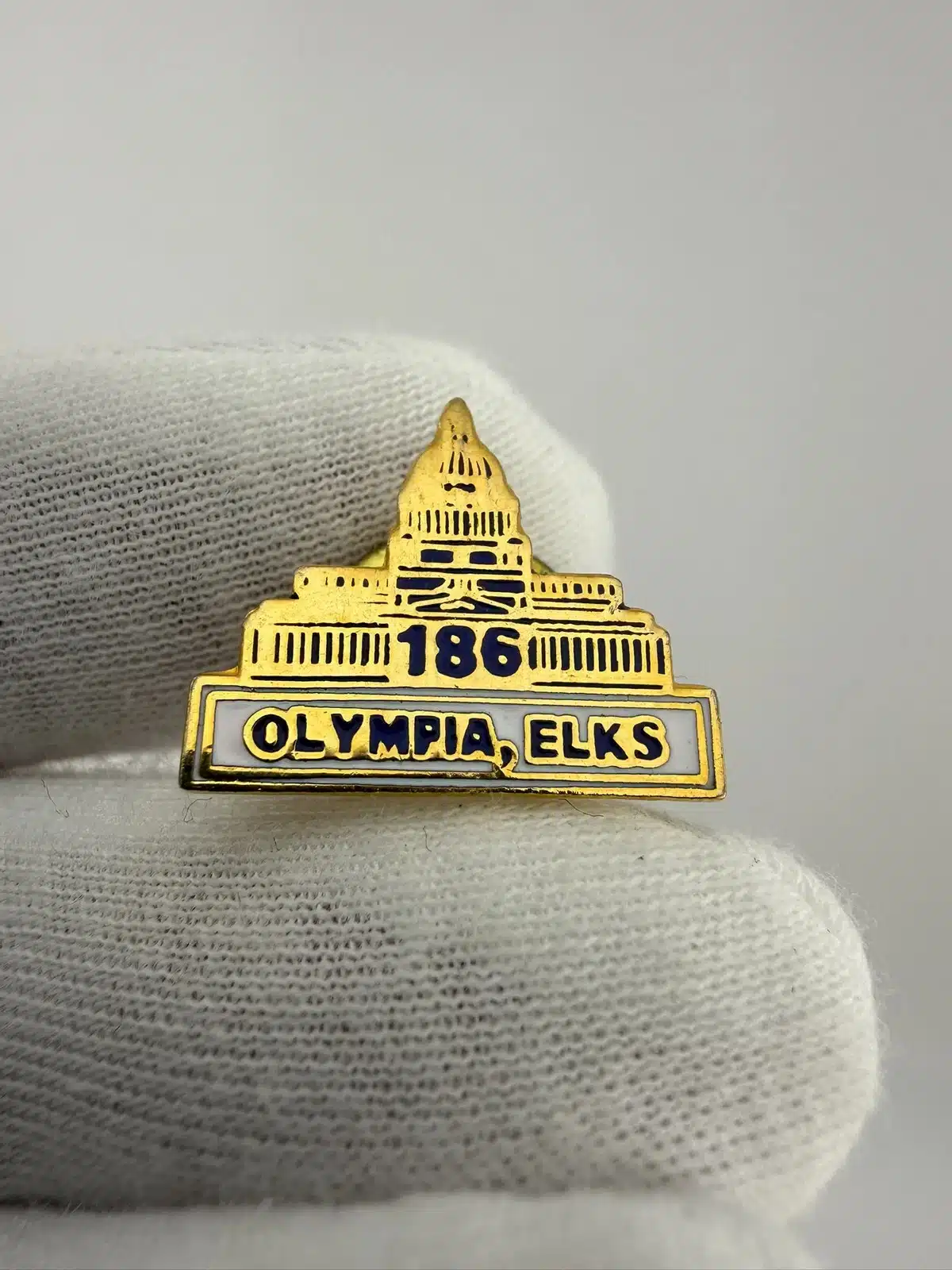 This gold tone pin features a detailed depiction of the Washington State Capitol, prominently displaying the number ‘186’ to signify the Elks Lodge #186 in Olympia. Below the Capitol, the words ‘OLYMPIA ELKS’ are elegantly inscribed, highlighting the lodge’s connection to the local community.