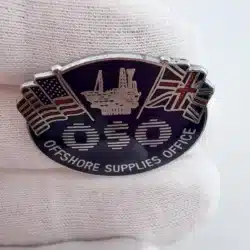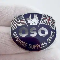 This oval-shaped pin features “OSO” prominently in the center, with “Offshore Supplies Office” displayed along the bottom. The design includes the American flag in the top left and the Union Jack in the top right, with an offshore oil platform depicted between them. The imagery reflects international cooperation within the offshore energy sector.