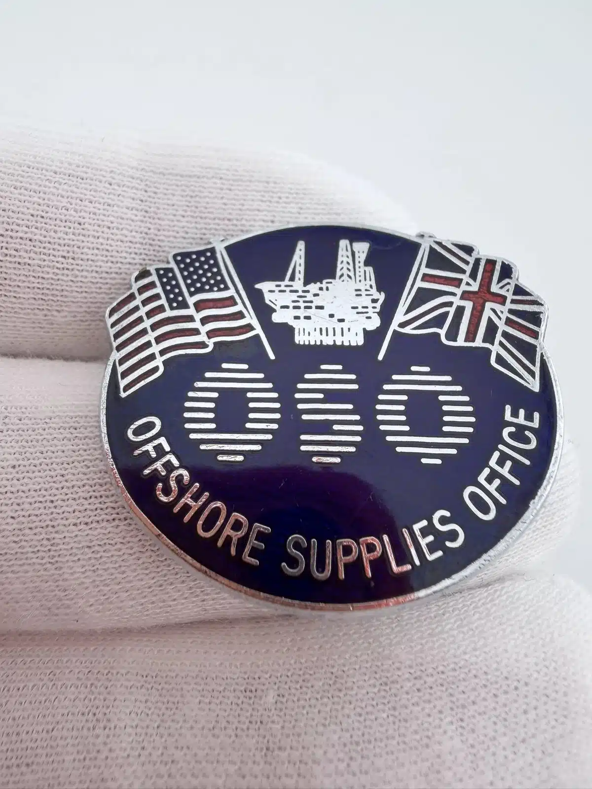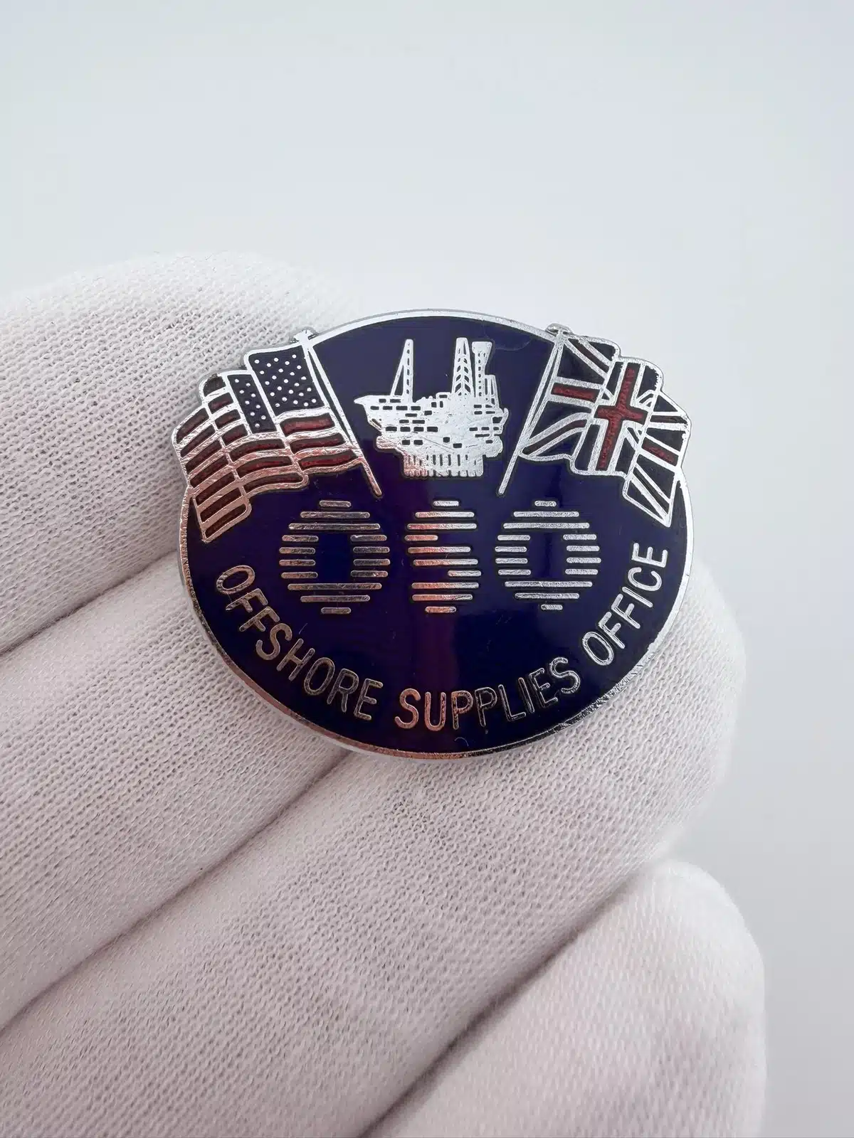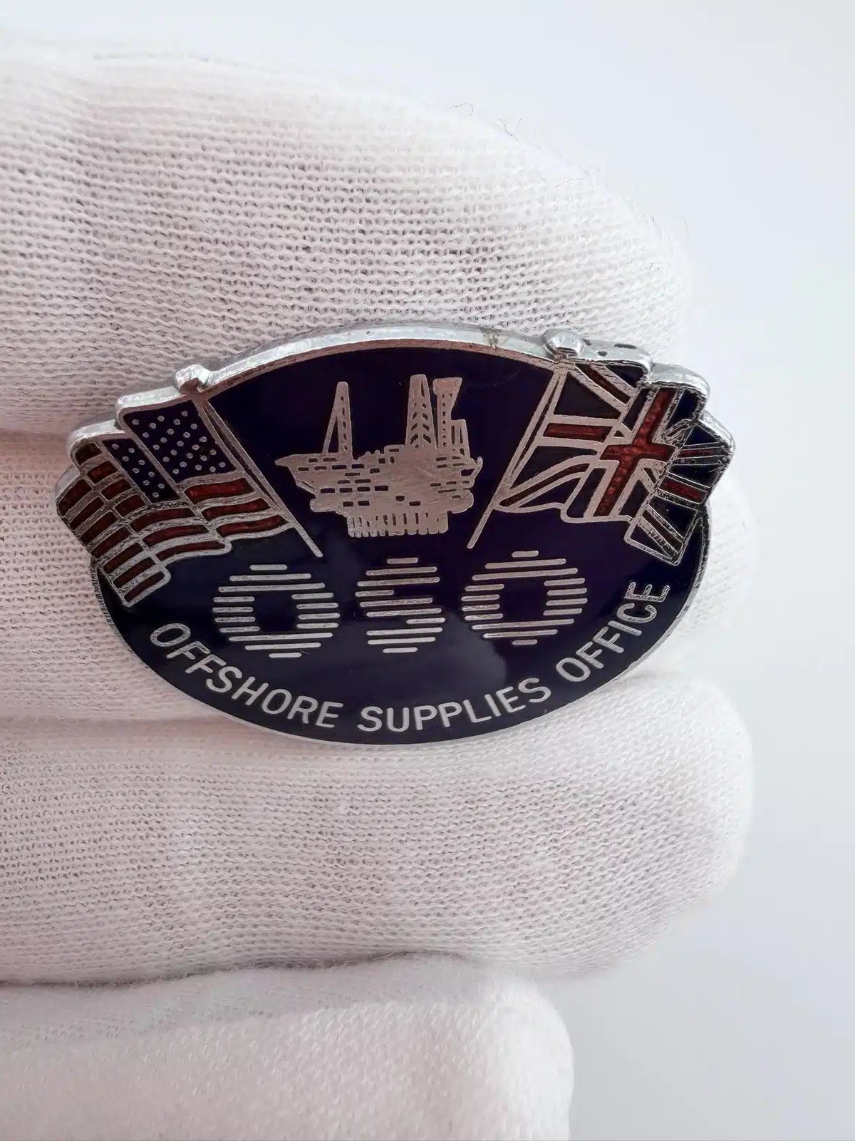 This oval-shaped pin features “OSO” prominently in the center, with “Offshore Supplies Office” displayed along the bottom. The design includes the American flag in the top left and the Union Jack in the top right, with an offshore oil platform depicted between them. The imagery reflects international cooperation within the offshore energy sector.